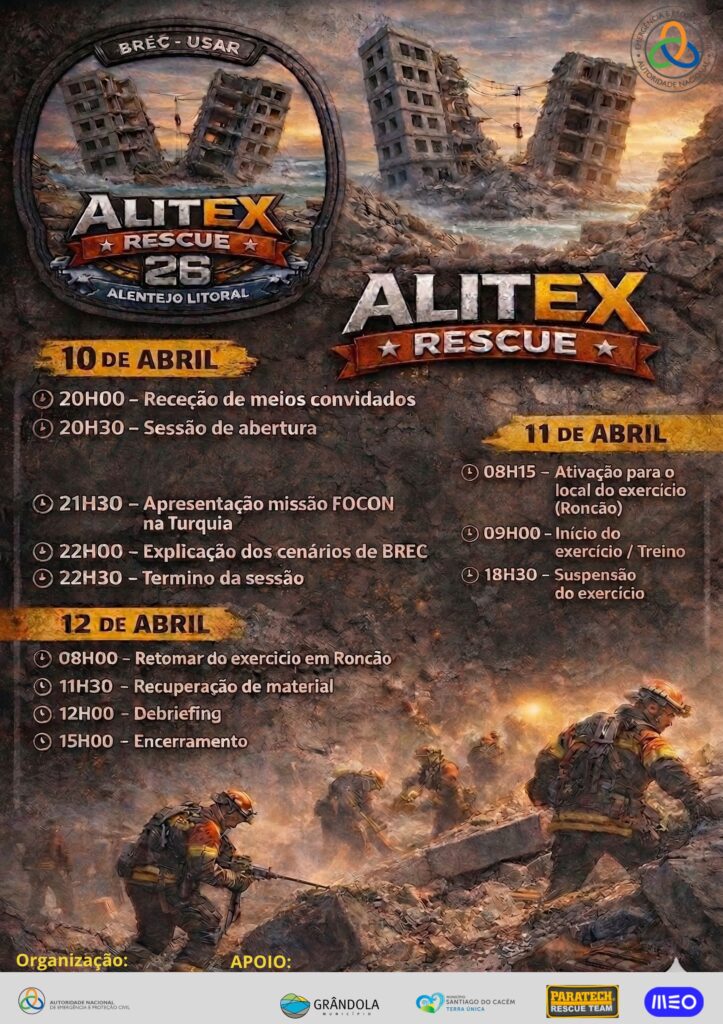 O Comando Sub-Regional de Emergência e Proteção Civil do Alentejo Litoral, em estreita colaboração com o Município de Santiago do Cacém e Grândola e os Corpos de Bombeiros da Sub-região, realiza entre os dias 10 e 12 de abril o exercício conjunto ALitEX RESCUE 26.
