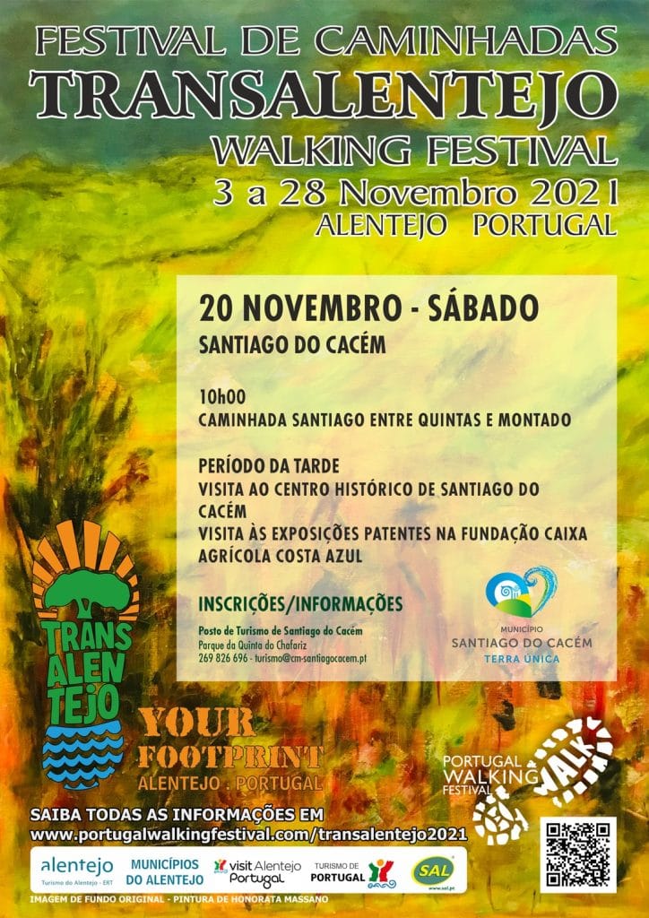 A Câmara Municipal de Santiago do Cacém associa-se ao Festival de Caminhadas TransAlentejo – TransAlentejo Walking Festival que realiza, no dia 20 de novembro, a partir das 10h00, a caminhada “Santiago Entre Quintas e Montado”, num percurso de 13 km, de grau fácil, com paragens em pontos de interesse numa descoberta do nosso património paisagístico, cultural e histórico. O período da tarde é reservado a uma visita ao Centro Histórico de Santiago do Cacém e às exposições patentes na Fundação Caixa Agrícola Costa Azul.