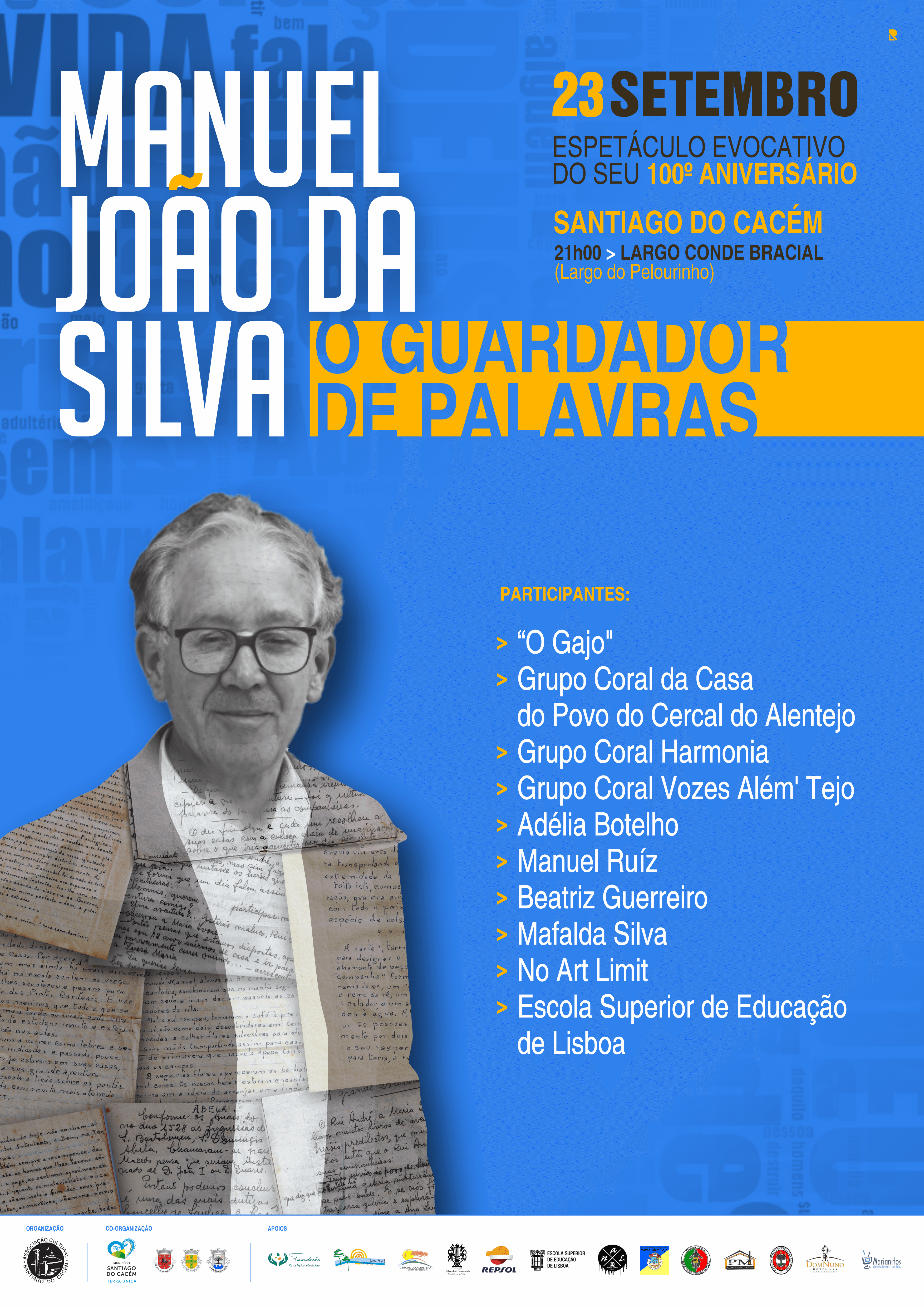 O 100.º aniversário de Manuel João da Silva, do “Guardador de Palavras”, é assinalado com um espetáculo evocativo e uma exposição biográfica. Profundo conhecedor da cultura local, em especial do concelho de Santiago do Cacém, destacou-se pelas várias investigações sobre os falares regionais. A iniciativa é organizada pela Associação Cultural de Santiago do Cacém, em parceria com a Câmara Municipal de Santiago do Cacém e União de Freguesias de Santiago do Cacém, Santa Cruz e São Bartolomeu da Serra.