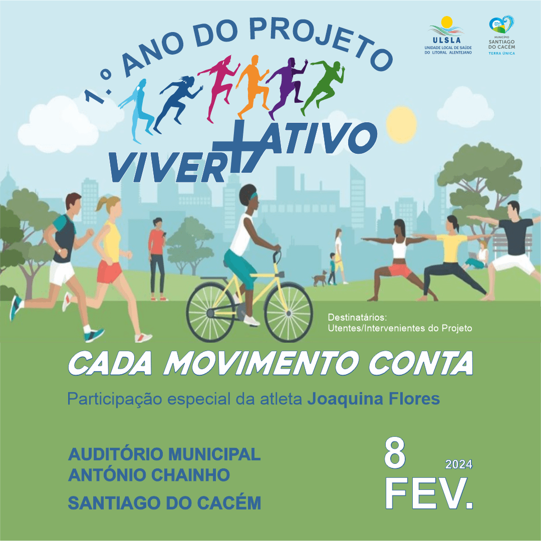 Realiza-se no dia 8 de fevereiro, a partir das 14h00, no Auditório Municipal António Chainho, em Santiago do Cacém, um encontro de balanço do primeiro ano do projeto “Viver + Ativo” com a participação especial da atleta Joaquina Flores e tem como destinatários os utentes/intervenientes deste Projeto.
