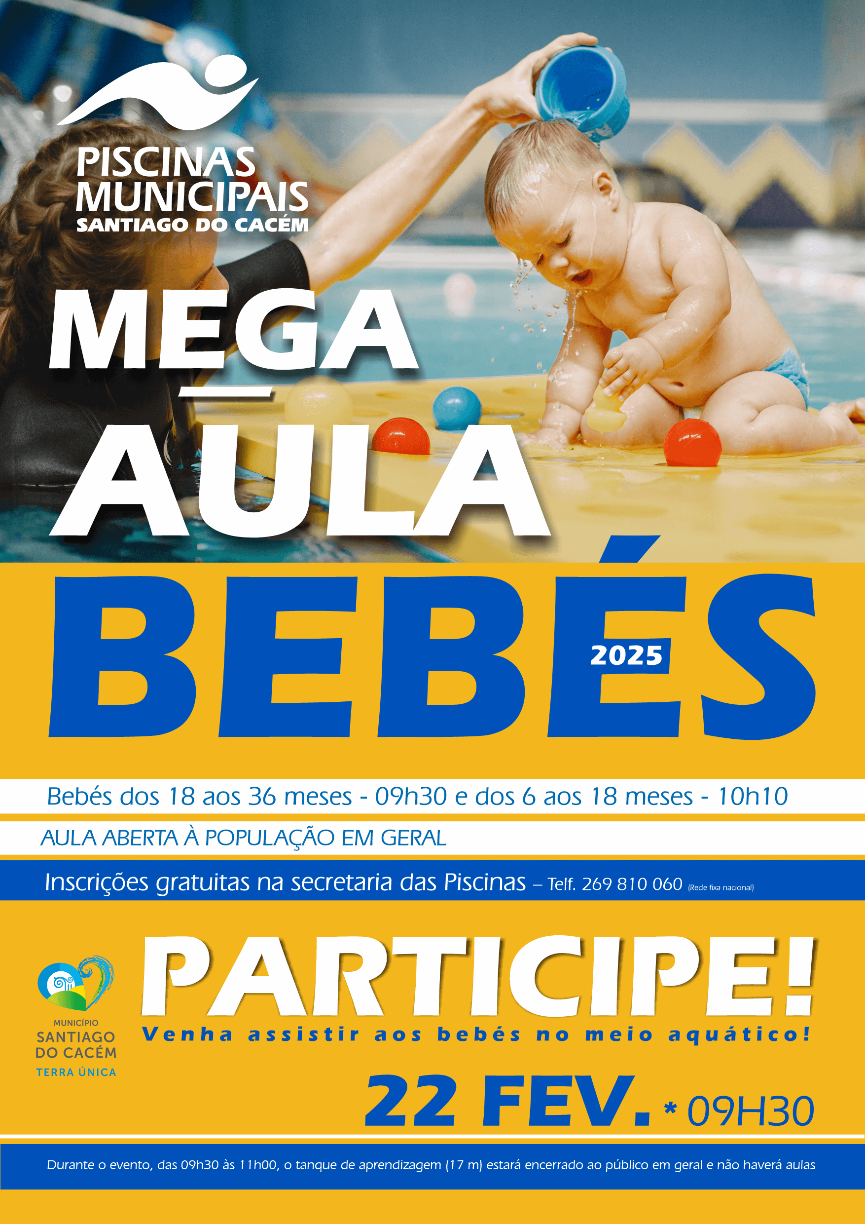 Piscinas Municipais de Santiago do CacémNo dia 22 de fevereiro, às 09h30, realiza-se uma Mega Aula de Bebés, nas Piscinas Municipais, em Santiago do Cacém. A aula é aberta à população em geral. Participe! […]
