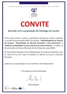 ![]() Dia 22 de março, 15h30, Sala de Sessões da Câmara Municipal de Santiago do Cacém. Nesta reunião serão debatidos vários assuntos, entre eles os apoios municipais, os benefícios fiscais e os incentivos financeiros. |