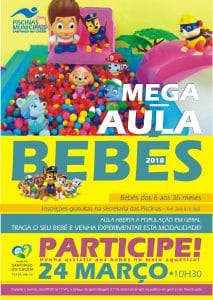 ![]() Dia 24 de março, nas Piscinas Municipais, Mega Aula de Bebés. Aula aberta à população em geral. Se tem um bebé entre os 6 e 36 meses, traga o seu bebé e venha experimentar esta modalidade! Inscrições gratuitas na secretaria das Piscinas ou através do tel.: 269 810 060.