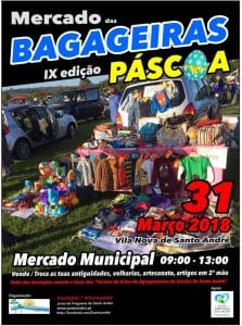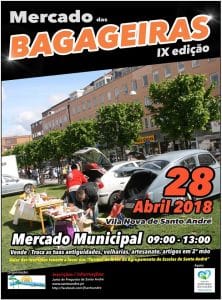 ![]() Dia 31 de março realiza-se a IX edição do Mercado das Bagageiras, no Mercado Municipal, em Vila Nova de Santo André. Nesta edição especial, as receitas vão reverter para as turmas de Artes do Agrupamento de Escolas de Santo André. Participe! |