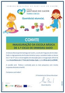 ![]() No dia 9 de abril, às 9h00, a Câmara Municipal de Santiago do Cacém, a Junta de Freguesia de Ermidas-Sado e o Agrupamento de Escolas Professor Arménio Lança, inauguram a nova Escola Básica de 1.º Ciclo de Ermidas-Sado. A ocasião será festiva e animada para os mais pequenos com muitas surpresas durante a manhã! |