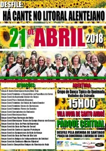 ![]() Dia 21 de abril, 15h00, em Vila Nova de Santo André. 19 grupos de cante alentejano desfilam pela Av. de Sines, Pç. da Concórdia e Av. de Sines. Atuação dos grupos no Parque Central. ![]() Dia 21 de abril, às 21h30, realiza-se no Auditório Municipal António Chainho, em Santiago do Cacém, o espetáculo Rock em Coro, uma produção do Coral Luísa Todi, cantor solista, Pablo Oliveira, bateria, Sérgio Caldeira, pianista, Ernesto Rodrigues, guitarra, Carlos Sequeira, baixo elétrico, Filipe Martins, com direção de Fernando Malão. A sua presença ajuda a Cercisiago. |