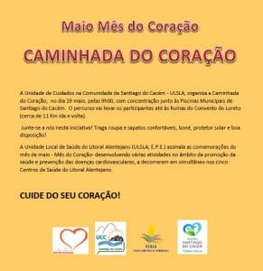 ![]() Dia 19 de maio, 09h00, concentração junto às Piscinas Municipais de Santiago do Cacém. Organização da Unidade de Cuidados na Comunidade de Santiago do Cacém - ULSLA. Cuide do seu coração, participe!