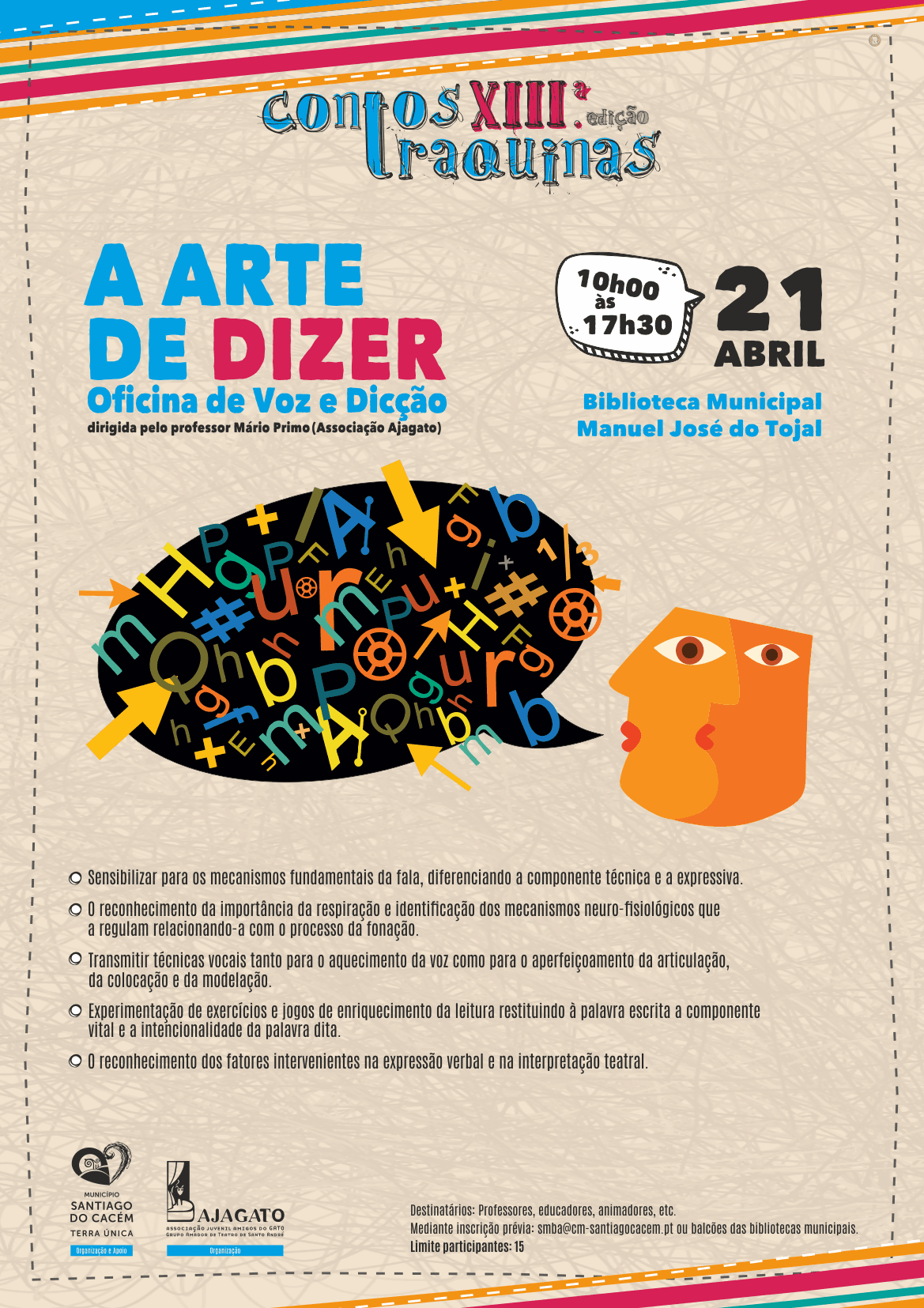 Dia 21 de abril, 10h00, Biblioteca Municipal Manuel José “do Tojal”. Oficina de voz e dicção orientado por Mário Primo. Destinatários: Professores, educadores, animadores, etc. Mediante inscrição prévia smba@cm-santiagocacem.pt ou aos balcões das Bibliotecas Municipais. Limite de inscrições:15