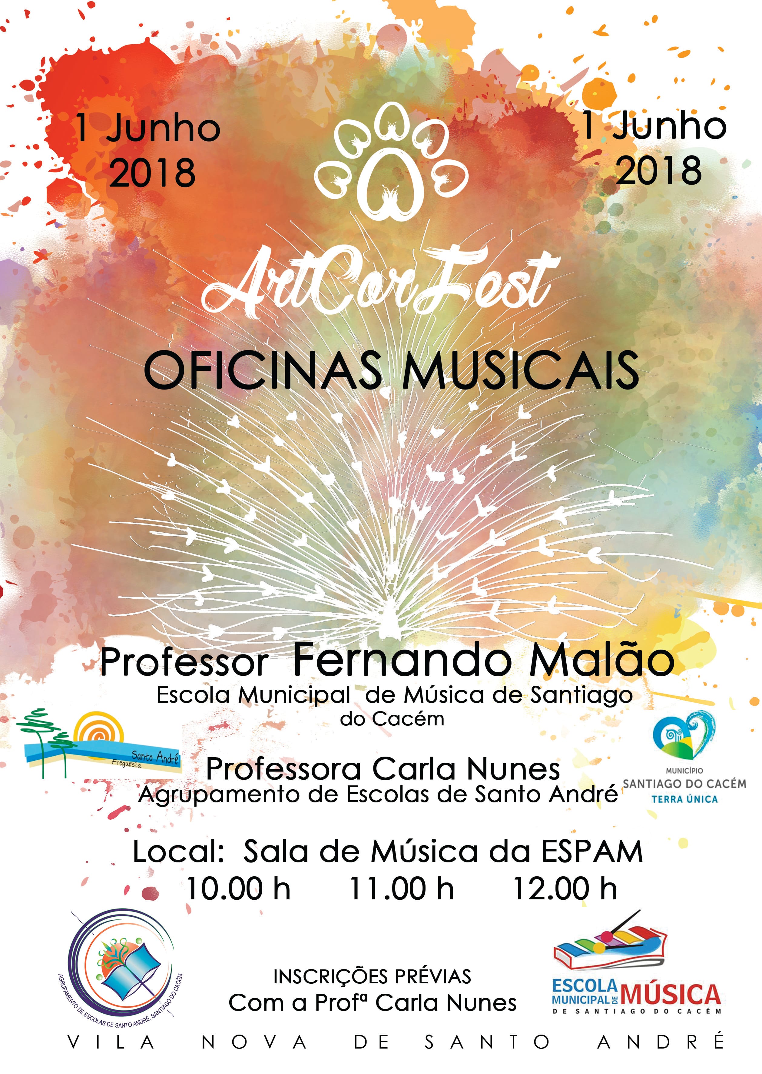 Dia 1 de junho realiza-se a ArtCor Fest – Oficinas Musicais com três sessões: 10h00, 11h00 e 12h00, na sala de música da Escola Secundária Padre António Macedo, em Vila Nova de Santo André. A iniciativa é dirigida pelo Professor Fernando Malão, da Escola Municipal de Música de Santiago do Cacém, e pela Professora Carla Nunes, do Agrupamento de Escolas de Santo André.