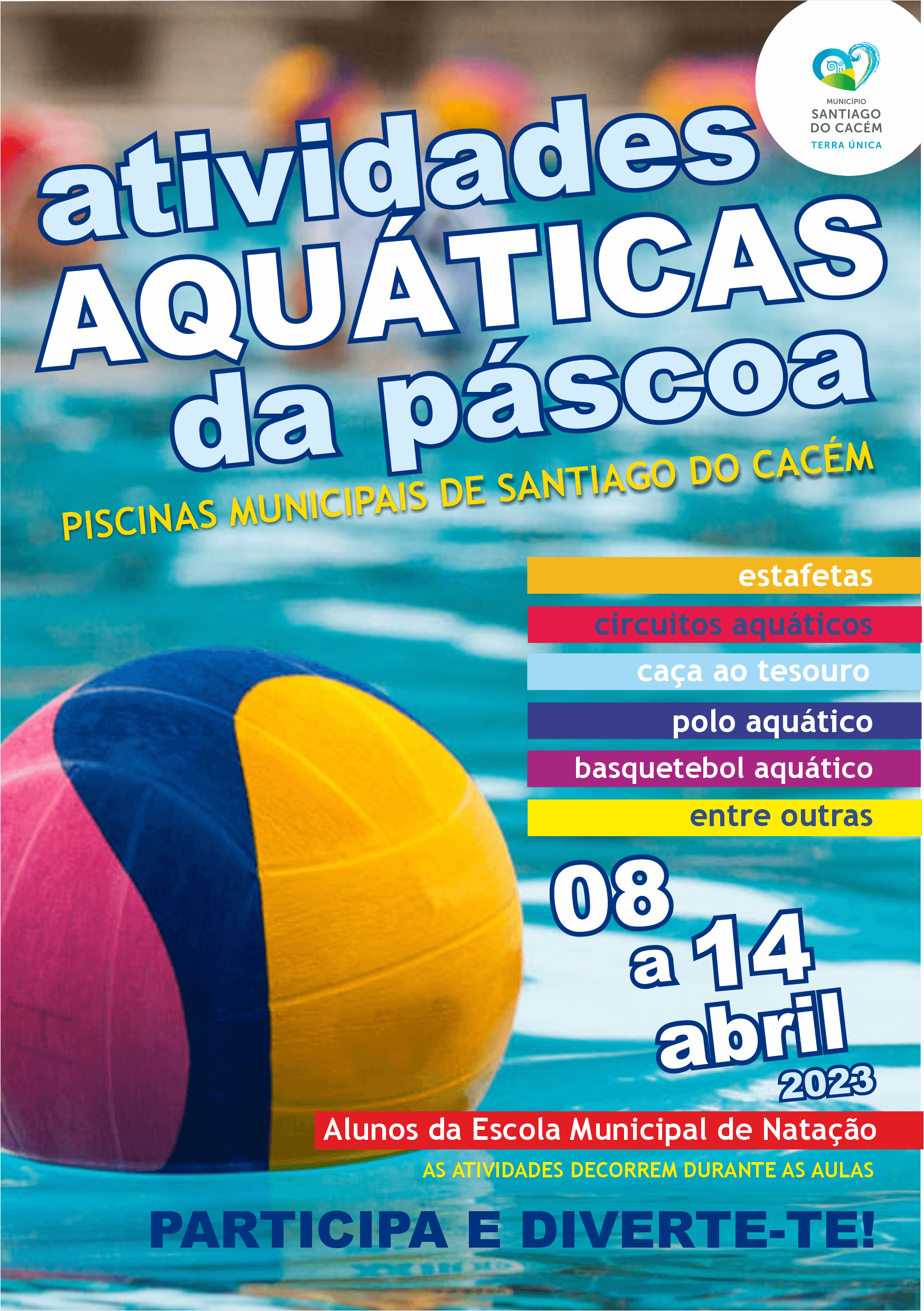 De 8 a 14 de abril realizam-se, nas Piscinas Municipais, em Santiago do Cacém, as Atividades Aquáticas da Páscoa. Estafetas, circuitos aquáticos, caça ao tesouro, polo aquático, basquetebol, entre outras. Participa e diverte-te!