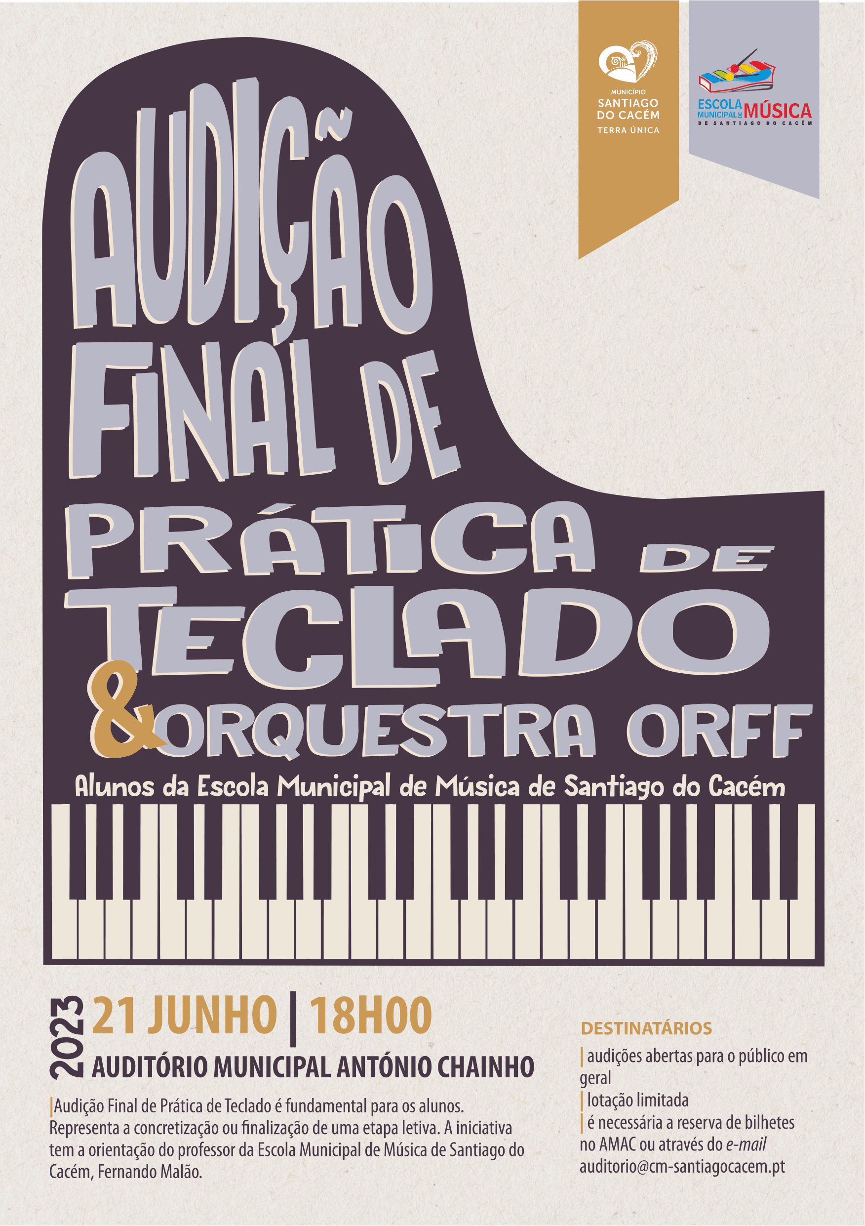 Realiza-se no dia 21 de junho, a partir das 18h00, no Auditório Municipal António Chainho, em Santiago do Cacém, a audição final de prática de teclado & orquestra orff.
