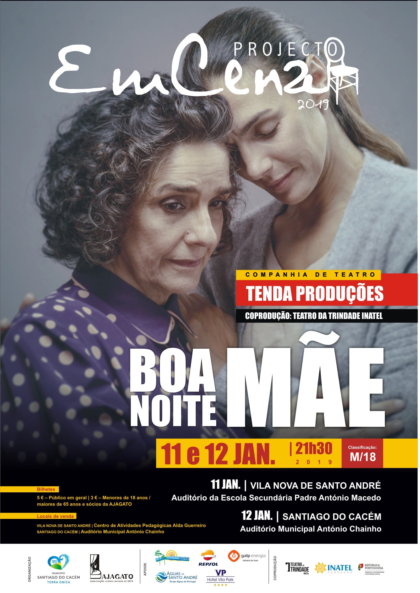Nos dias 11 e 12 de janeiro, às 21h30, em Vila Nova de Santo André e em Santiago do Cacém, respetivamente, peça de teatro Boa Noite Mãe, do Projecto EmCena da Companhia de Teatro Tenda Produções, com coprodução do Teatro da Trindade Inatel. Classificação M/18.