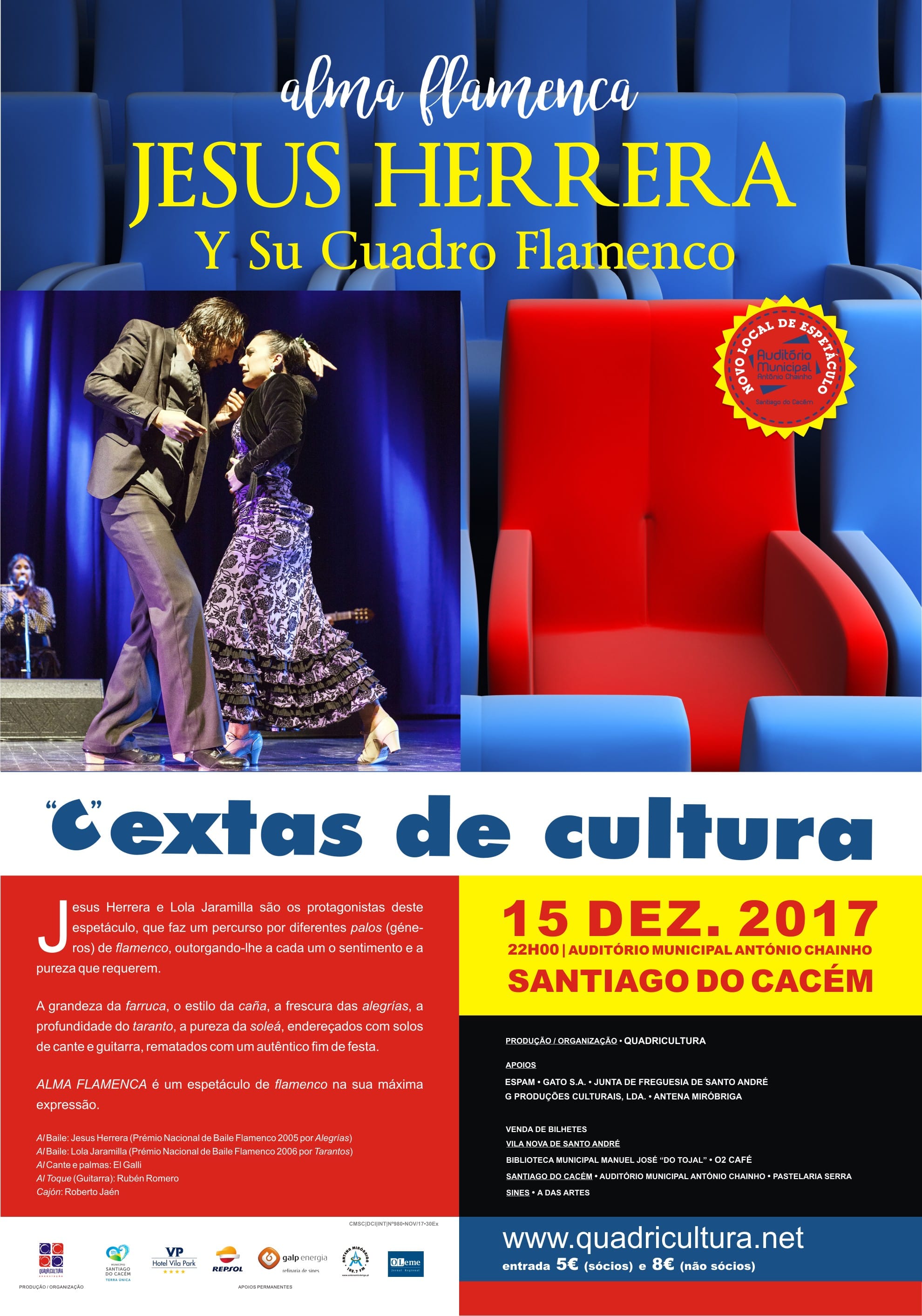 Dia 15 de dezembro, às 22h00, no Auditório Municipal António Chainho, em Santiago do Cacém, espetáculo das “C”extas de Cultura com Alma Flamenca e Jesus Herrera Y su Cuadro Flamenco. Não perca!