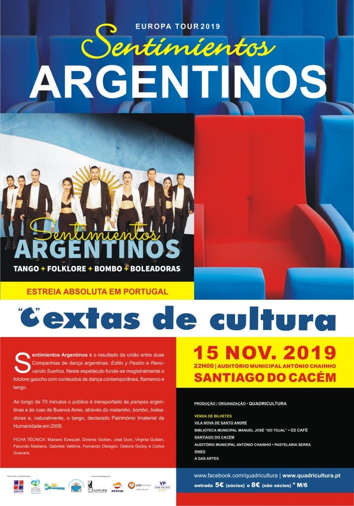 Dia 15 de novembro, 22h00, no Auditório Municipal António Chainho, as “C”extas de Cultura trazem até ao público o espetáculo “Sentimientos Argentinos”. Neste espetáculo funde-se magistralmente o folclore gaúcho com conteúdos de dança contemporânea, flamenco e tango.”Sentimientos argentinos” é o resultado espetacular da união entre duas prestigiadas companhias de dança argentinas: Estilo y Pasión e Renovando Sueños.