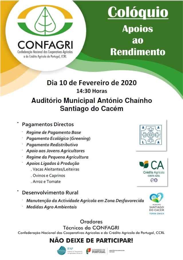 Realiza-se dia 10 de fevereiro, 14h30, no Auditório Municipal António Chaínho em Santiago do Cacém o colóquio da Confagri sobre ” Apoios aos rendimentos”. Temas a abordar: