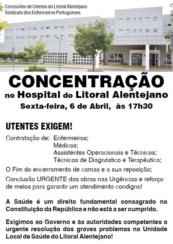 Dia 6 de março, 17h30, junte-se à Comissão de Utentes do Litoral Alentejano e ao Sindicato dos Enfermeiros para exigir a contratação de mais profissionais de saúde, o fim do encerramento de camas e a conclusão urgente das obras nas urgências.