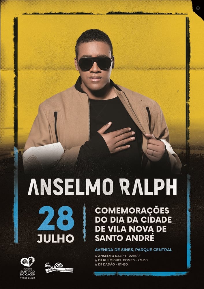 Dia 28 de julho, às 22h00, no âmbito das comemorações do dia da Cidade de Vila Nova de Santo André, espetáculo com Anselmo Ralph, junto ao Parque Central. A partir das 23h30 DJ Rui Miguel Gomes e DJ Dadão. Aparece!