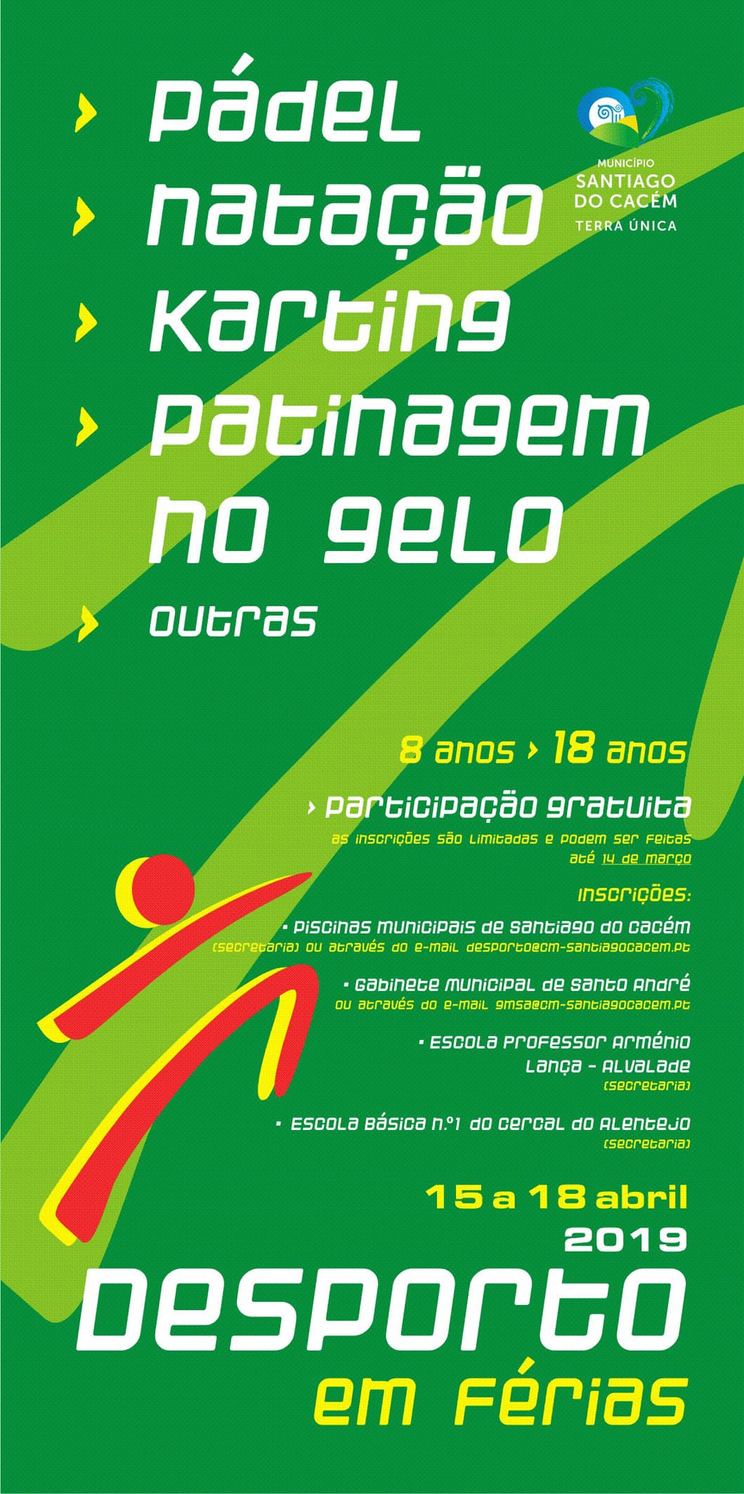 O Desporto em Férias decorre entre 15 e 18 de abril e destina-se a crianças e jovens entre os 8 e os 18 anos. Um projeto da Câmara Municipal de Santiago do Cacém que visa a ocupação dos tempos livres dos jovens do Município durante as férias, através de atividades desportivas e de exploração da natureza: pádel, natação, karting, patinagem no gelo, entre outras…! Inscrições abertas até 14 de março!