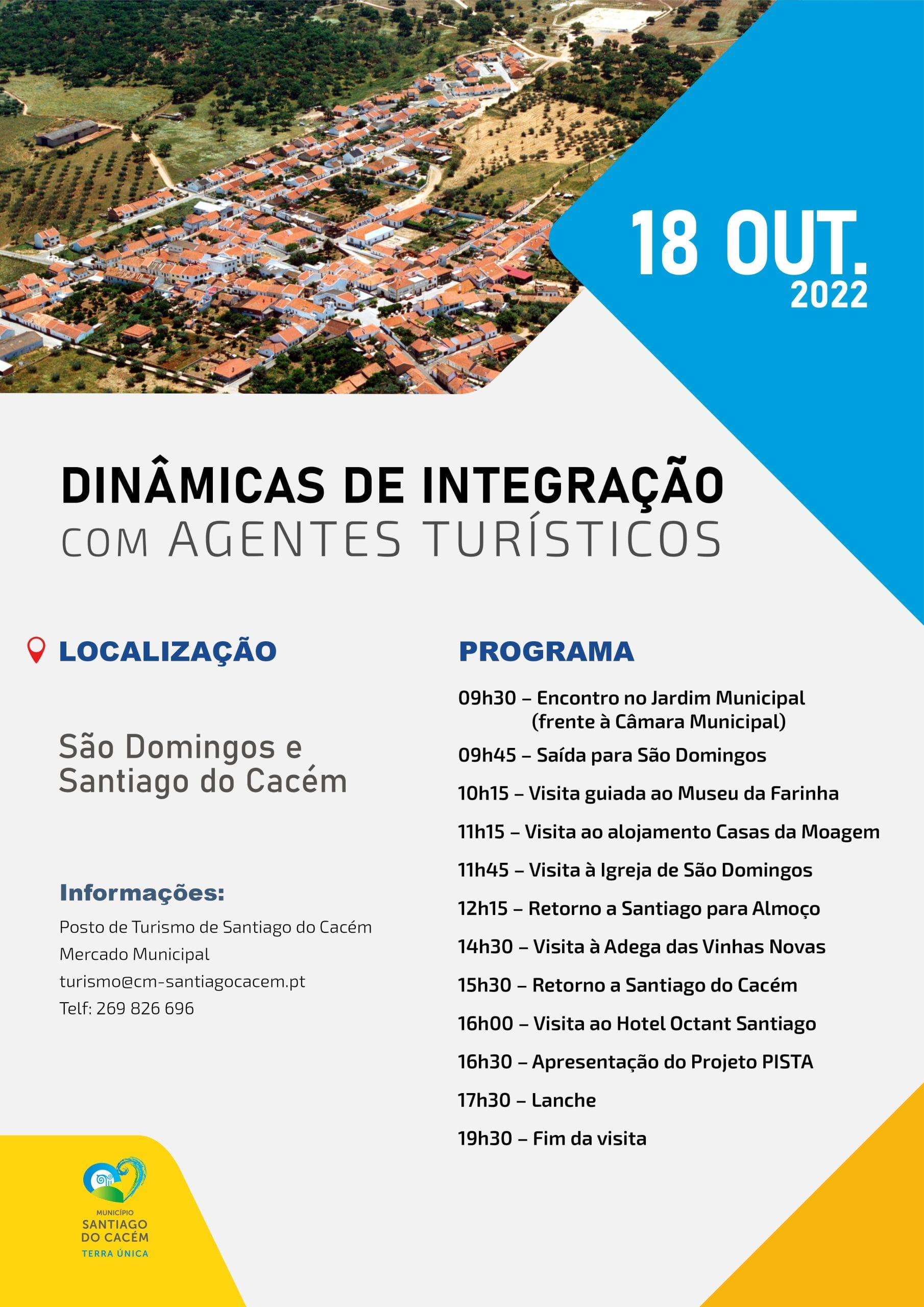 O município de Santiago do Cacém irá promover , no dia 18 de outubro, entre as 09h30 e as 19h30, a realização de uma visita com caráter instrutivo integrada na iniciativa “Dinâmicas de Integração com Agentes Turísticos”. Este evento tem como objetivo aprofundar o intercâmbio e promover a colaboração e cooperação entre os agentes turísticos do nosso concelho, relações que podem estruturar e consolidar o turismo como um instrumento de desenvolvimento da região.