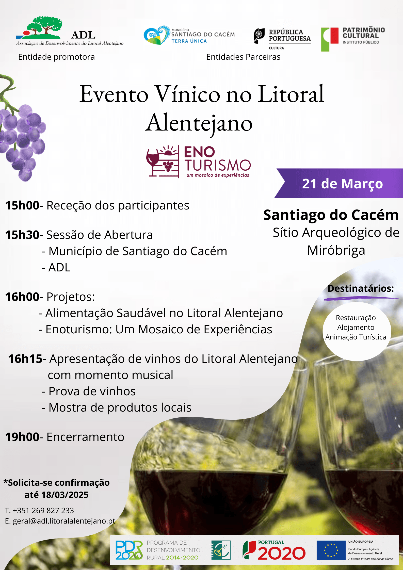 A ADL – Associação de Desenvolvimento do Litoral Alentejano, em parceria com a APVCA – Associação de Produtores de Vinho da Costa Alentejana, e os Municípios do Litoral Alentejano irão realizar 5 Workshops /eventos vínicos com prova de vinhos, de 18 a 22 de março, com o objetivo de dar a conhecer os vinhos do território às empresas de restauração, alojamento e animação turística.