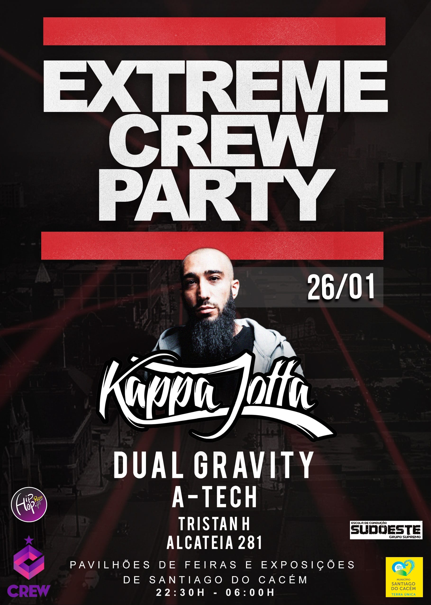 Dia 26 de janeiro, 22h30, Pavilhão Municipal de Exposições em Santiago do Cacém. Com: Kappa Jotta, Dual Gravity, A- Tech, Tristan H, Alcateia 281. Integrado no Projeto Atreve-te da Câmara Municipal.