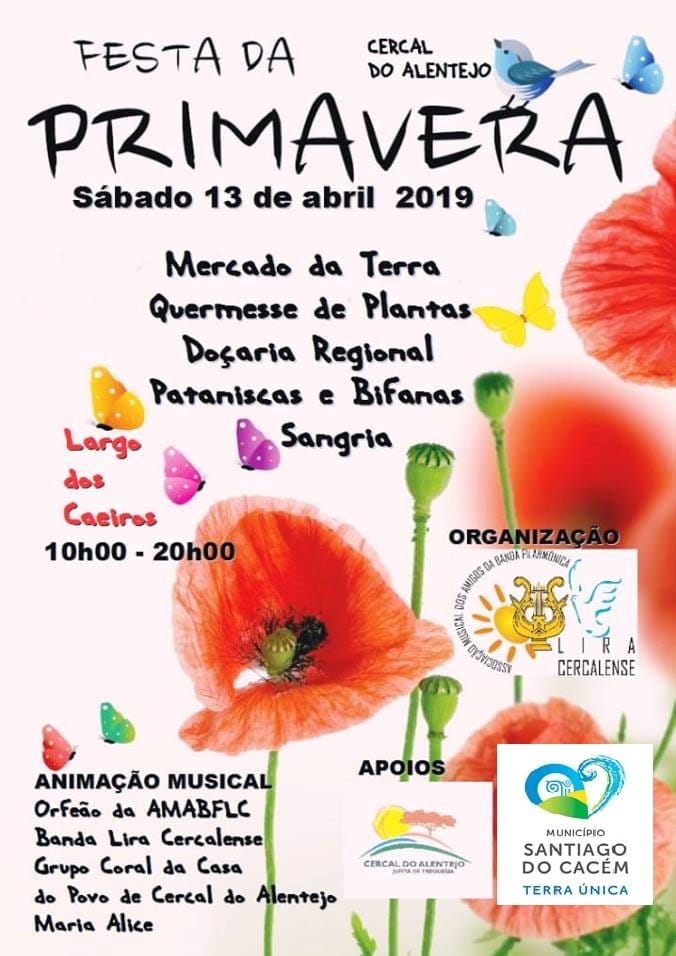 No dia 13 de abril, entre as 10h00 e as 20h00, no Largo dos Caeiros, no Cercal do Alentejo, realiza-se a Festa da Primavera. Mercado da Terra, Quermesse, Doçaria Regional, Comes e bebes e muita animação. Não falte!
