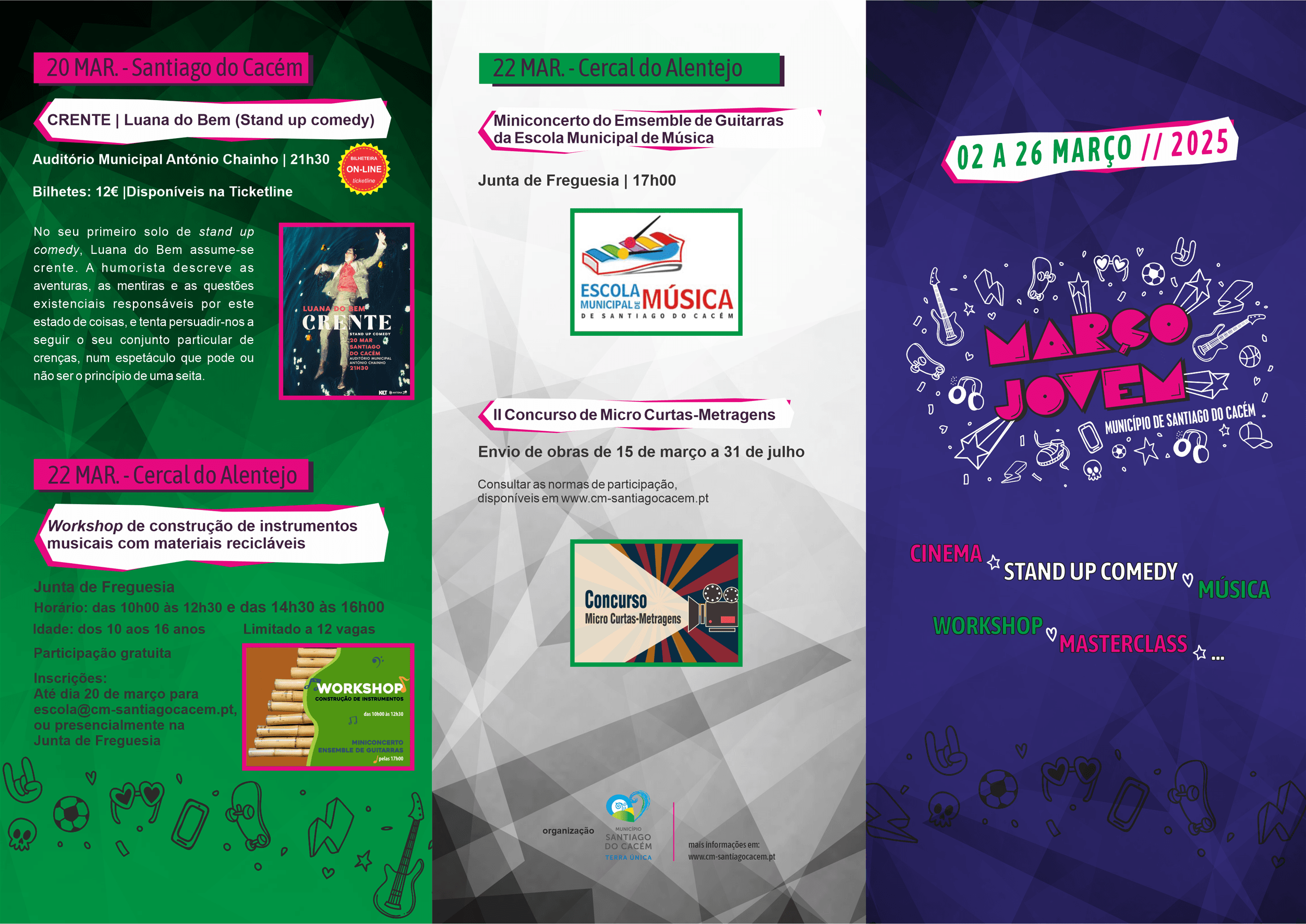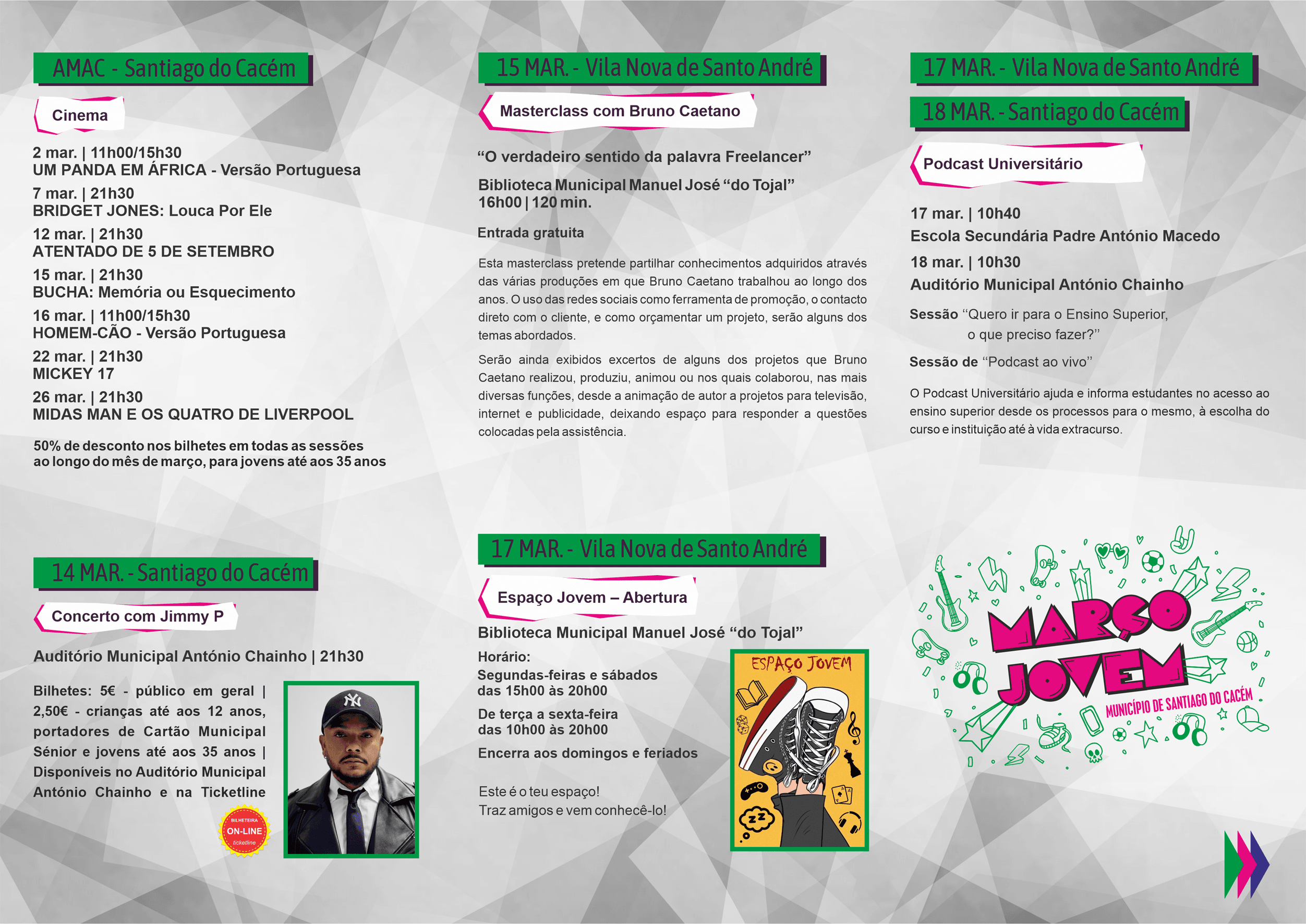 Março é o mês em que se assinala o Dia Nacional da Juventude, e a Câmara Municipal de Santiago do Cacém promove a iniciativa “Março Jovem” de 2 a 26 de março, no Município de Santiago do Cacém, com uma programação com atividades direcionadas aos Jovens do Município.