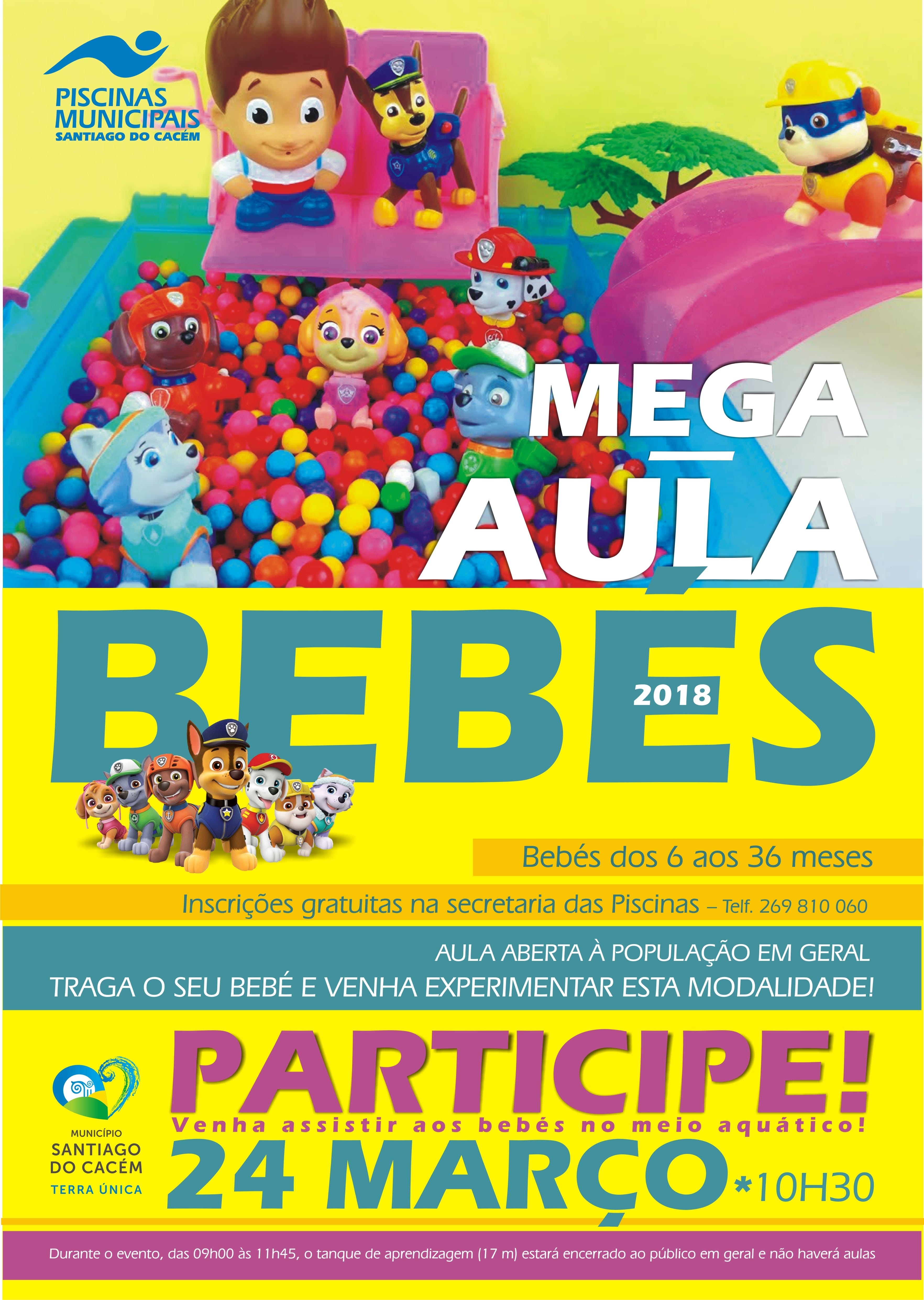 Dia 24 de março, nas Piscinas Municipais, Mega Aula de Bebés. Aula aberta à população em geral. Se tem um bebé entre os 6 e 36 meses, traga o seu bebé e venha experimentar esta modalidade!
