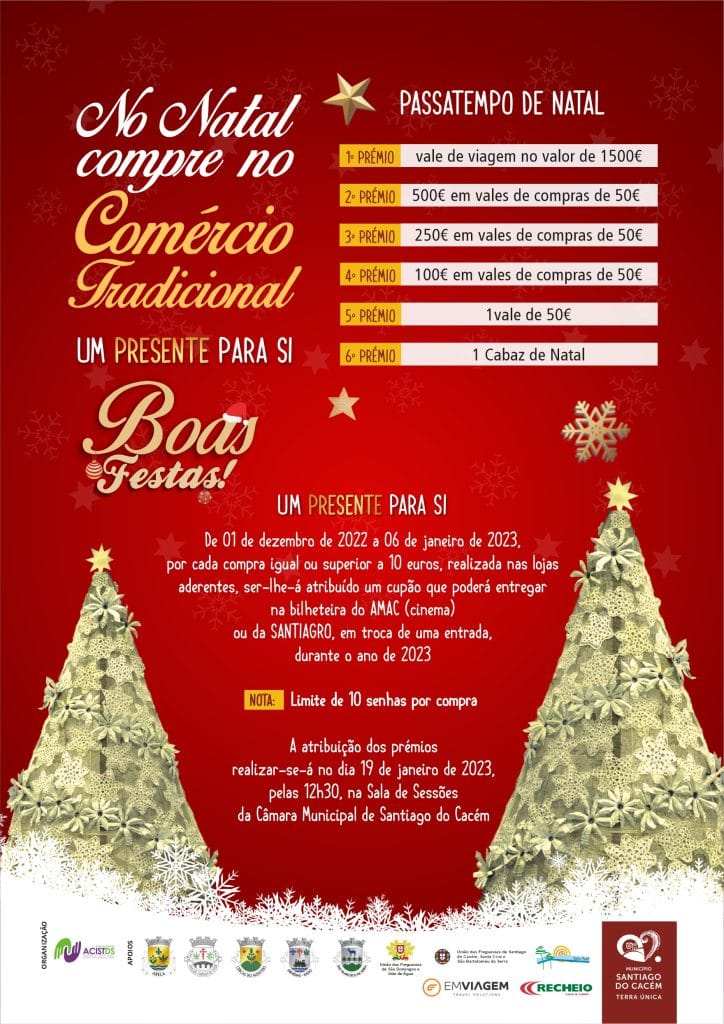 O Passatempo “No Natal Compre no Comércio Tradicional” é uma iniciativa promovida pelo Município de Santiago do Cacém em parceria com a ACISTDS e com o apoio das juntas de Freguesia do Município, que tem como objetivo promover e estimular as dinâmicas no comércio e serviços locais, incentivando a realização das compras na época natalícia no comércio.