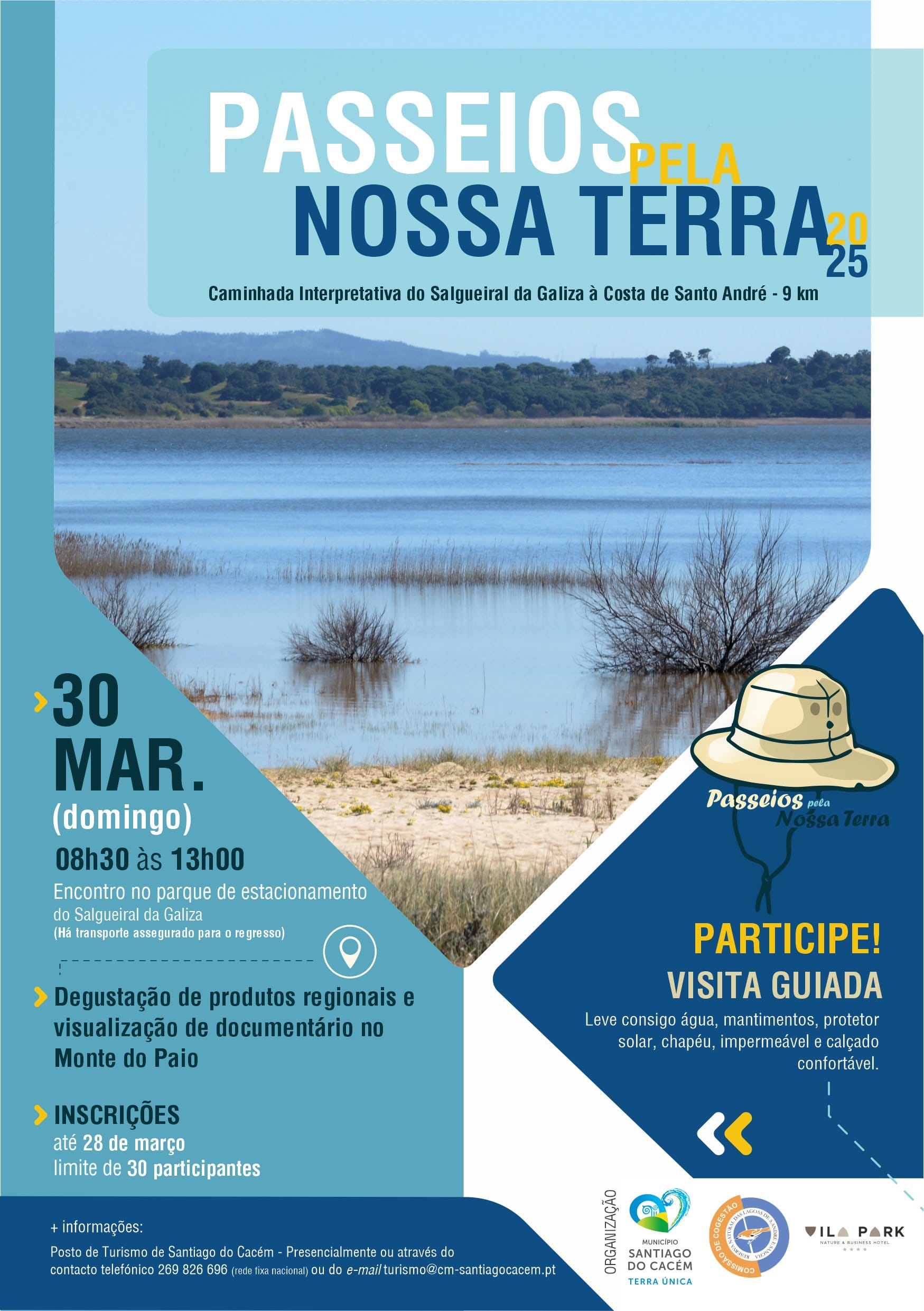 Realiza-se no dia 30 de março, entre as 08h30 e as 13h00, a iniciativa Passeios pela Nossa Terra – Caminhada Interpretativa do Salgueiral da Galiza à Costa de Santo André, com visita guiada de 9 km.