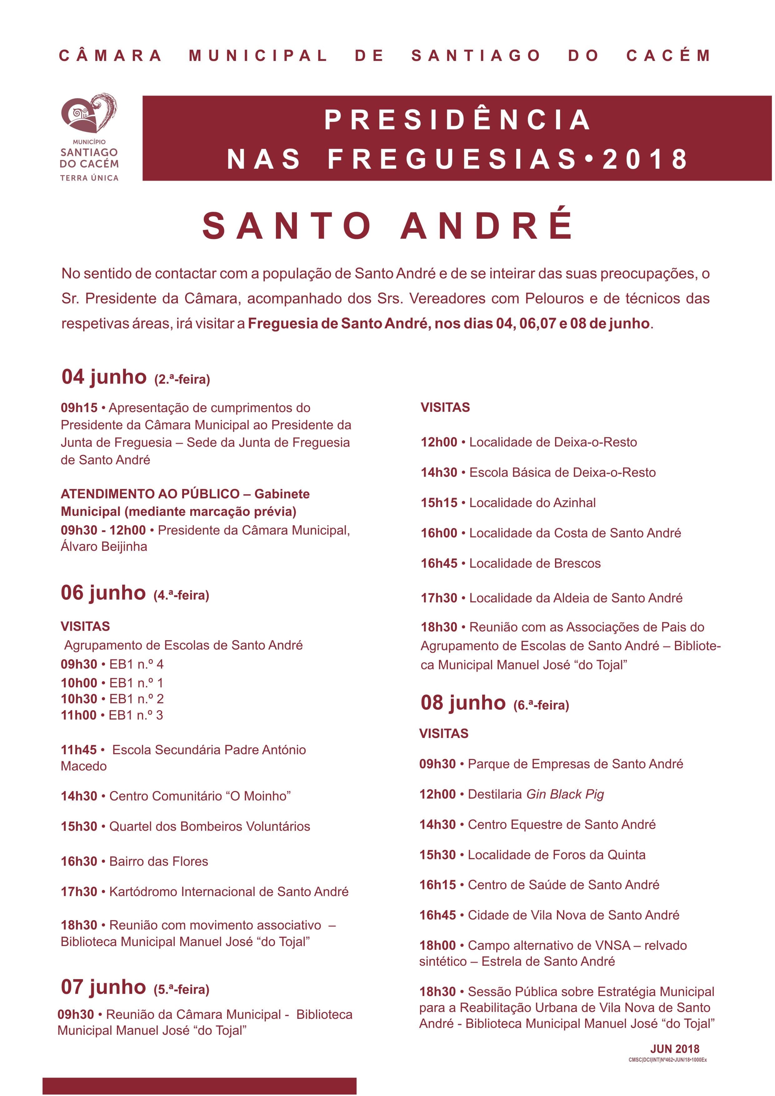 No sentido de contactar de perto com a população e de se inteirar das suas preocupações, o executivo a tempo inteiro da Câmara Municipal anda a percorrer o Município, no âmbito, da Presidência nas Freguesias. A Freguesia de Santo André irá ser visitada nos dias 4, 6, 7 e 8 de junho.