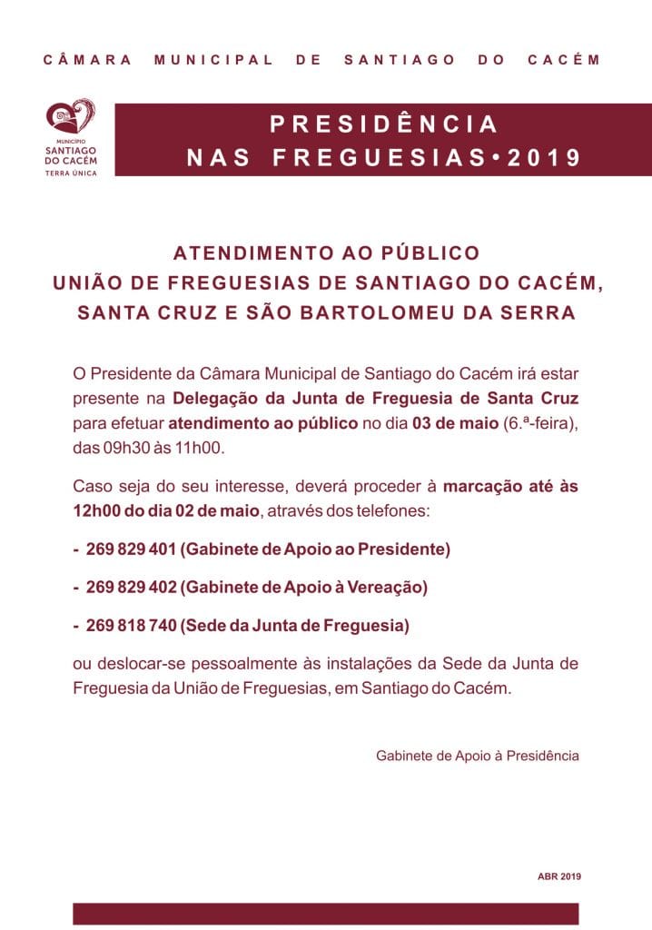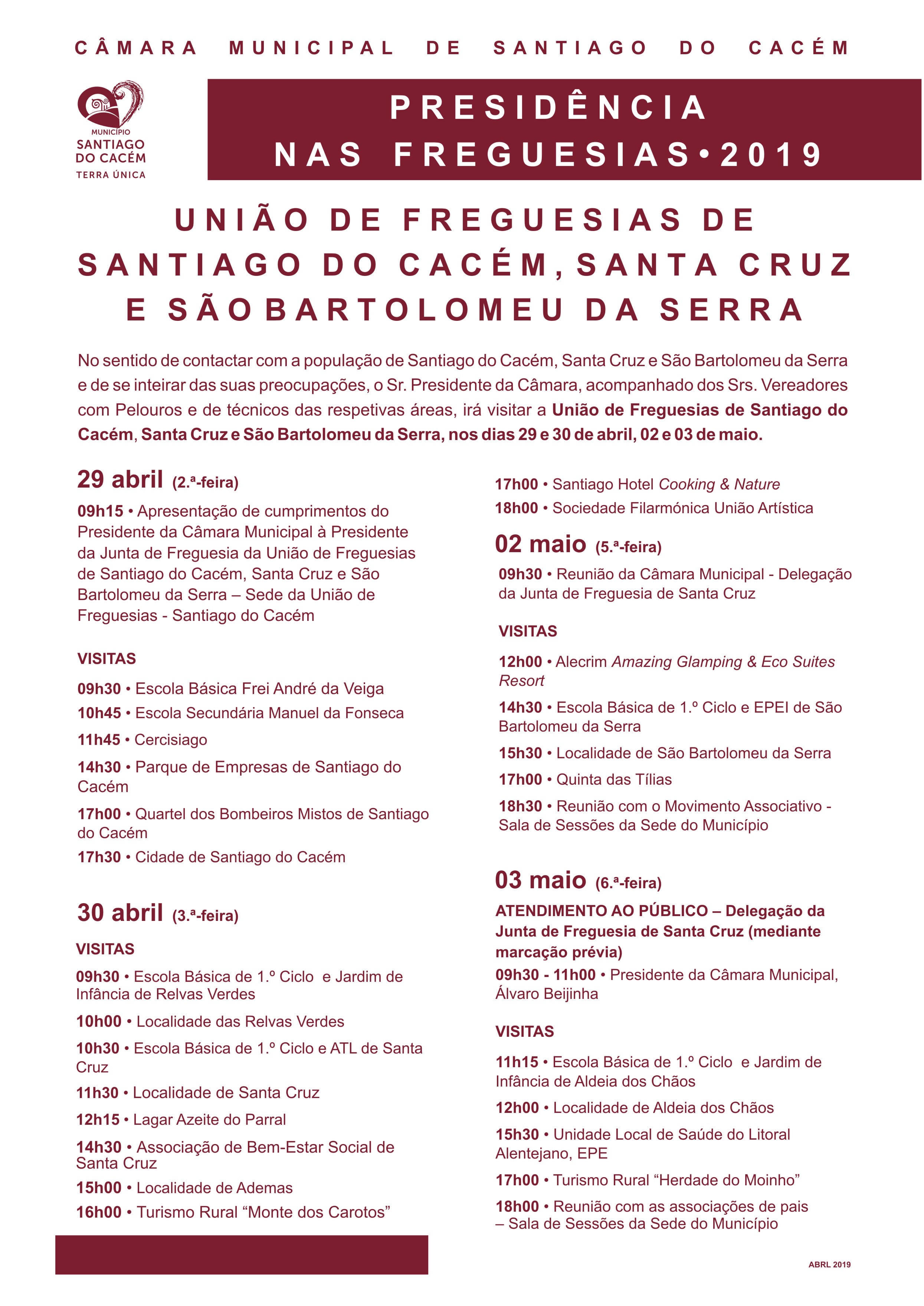 De 29 de abril a 3 de maio realiza-se a Presidência nas Freguesias 2019, na União das Freguesias de Santiago do Cacém, Santa Cruz e São Bartolomeu da Serra, no sentido de contactar com a população e de se inteirar das suas preocupações, o Presidente da Câmara, faz-se acompanhar dos Vereadores com pelouros e dos Técnicos das respetivas áreas.