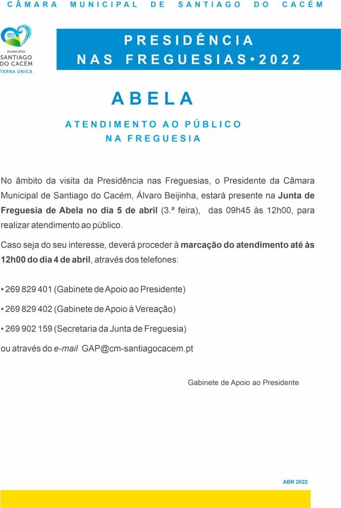 O Presidente da Câmara Municipal de Santiago do Cacém e os Vereadores com pelouros, acompanhados pelos técnicos das respetivas áreas, irão visitar a freguesia de Abela, nos dias 5, 7 e 8 de abril de 2022, com o objetivo de contactar e de se inteirar das preocupações da população.