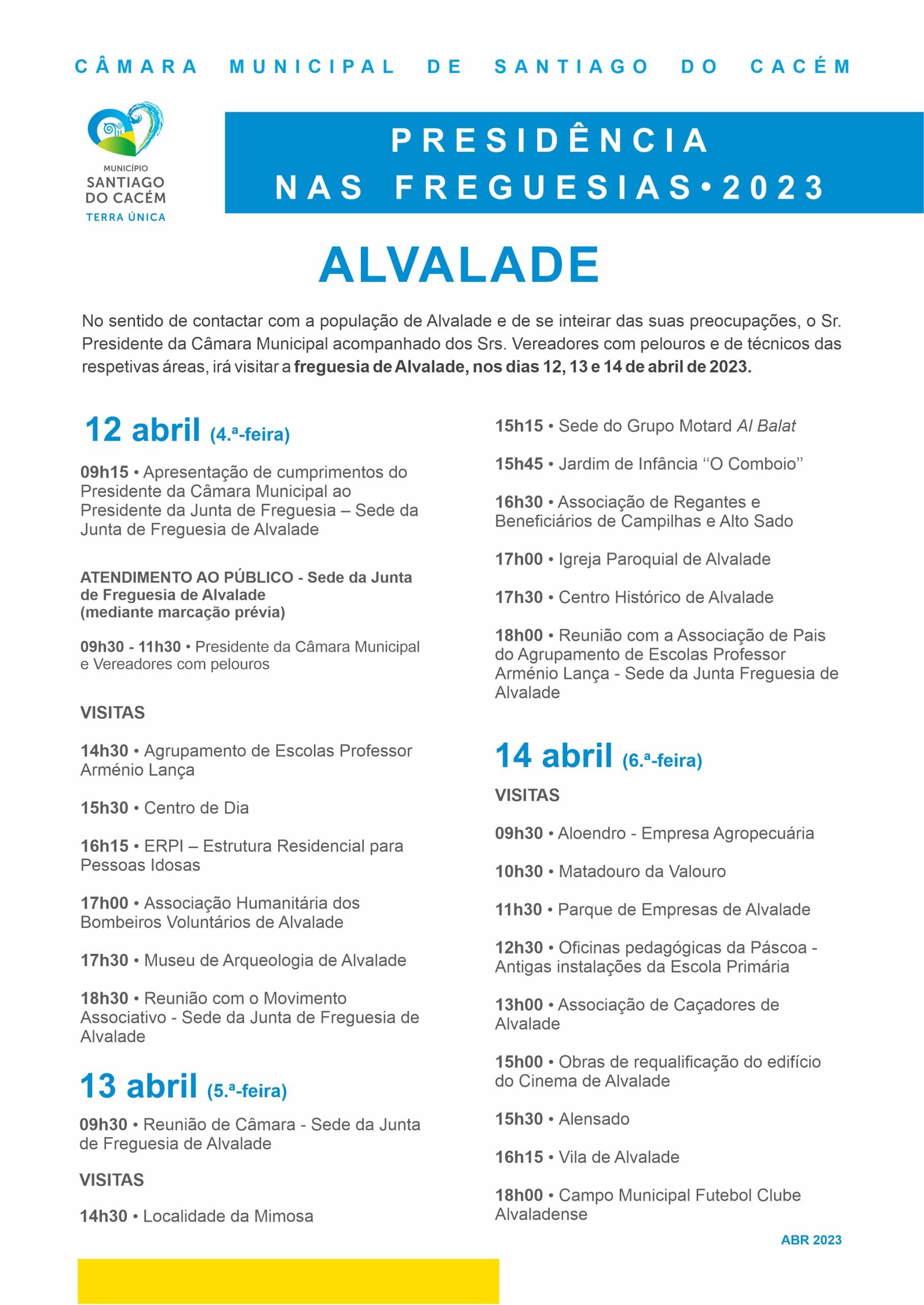 O Presidente da Câmara Municipal de Santiago do Cacém e os Vereadores com pelouros, acompanhados pelos técnicos das respetivas áreas, irão visitar a Freguesia de Alvalade, nos dias 12, 13 e 14 de abril de 2023, com o objetivo de contactar e de se inteirar das preocupações da população.