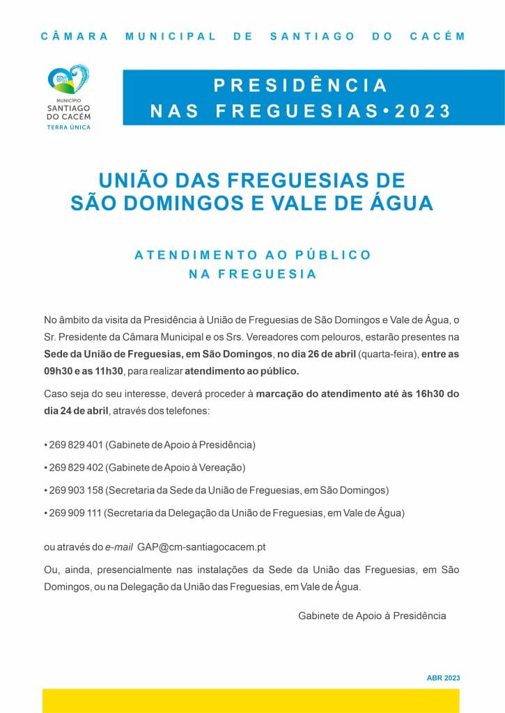 O Presidente da Câmara Municipal de Santiago do Cacém e os Vereadores com pelouros, acompanhados pelos técnicos das respetivas áreas, irão visitar a freguesia União das Freguesias de São Domingos e de Vale de Água, nos dias 26, 27 e 28 de abril de 2023, com o objetivo de contactar e de se inteirar das preocupações da população.