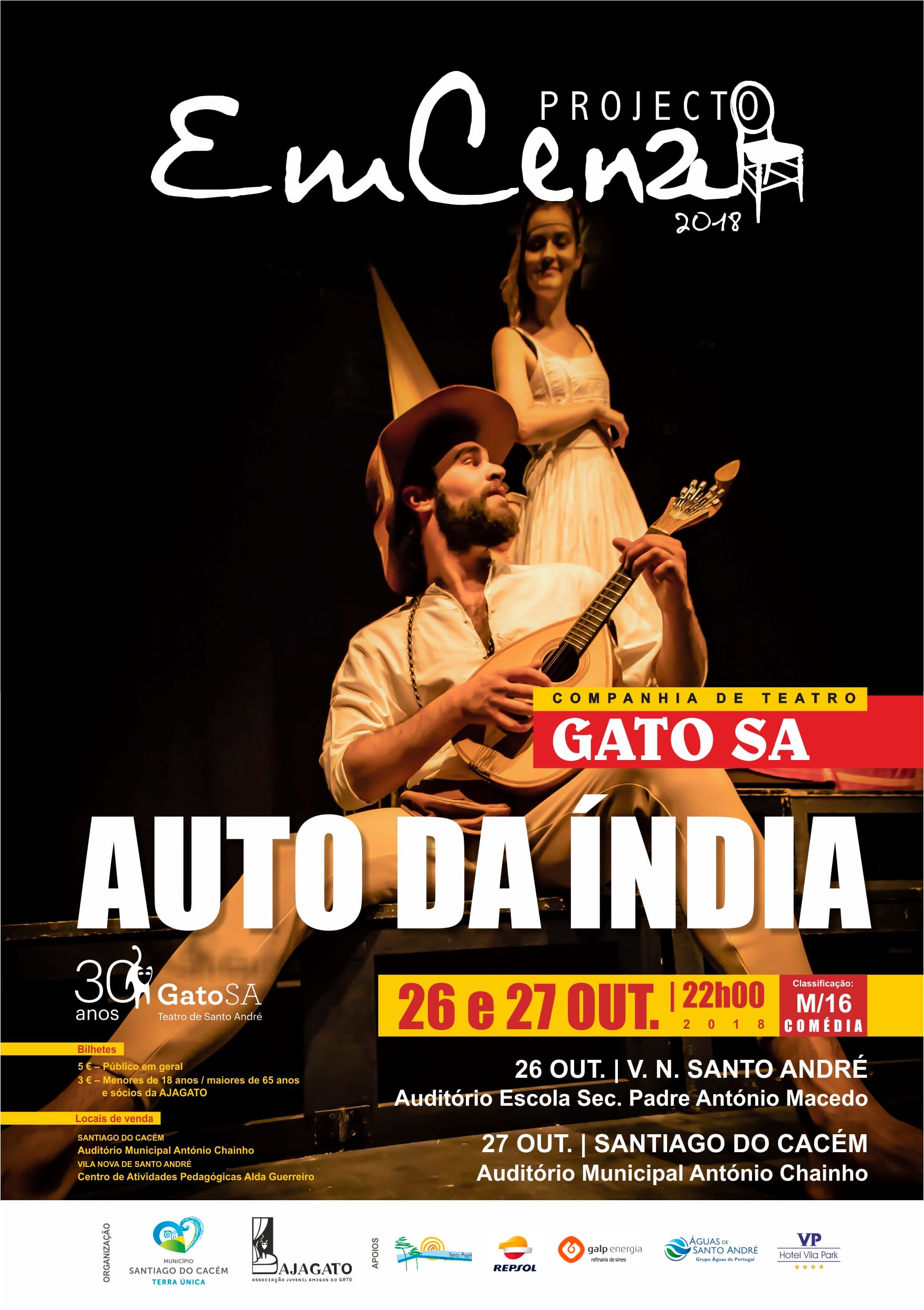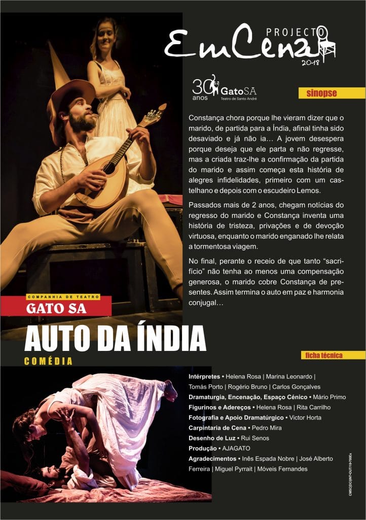 Nos dias 26 e 27 de outubro, às 22h00, vai estar em cena, no Auditório da Escola Secundária Padre António Macedo, em Vila Nova de Santo André e no Auditório Municipal António Chainho, em Santiago do Cacém, respetivamente, a peça Auto da Índia, no âmbito do Projecto EmCEna, com classificação M12.