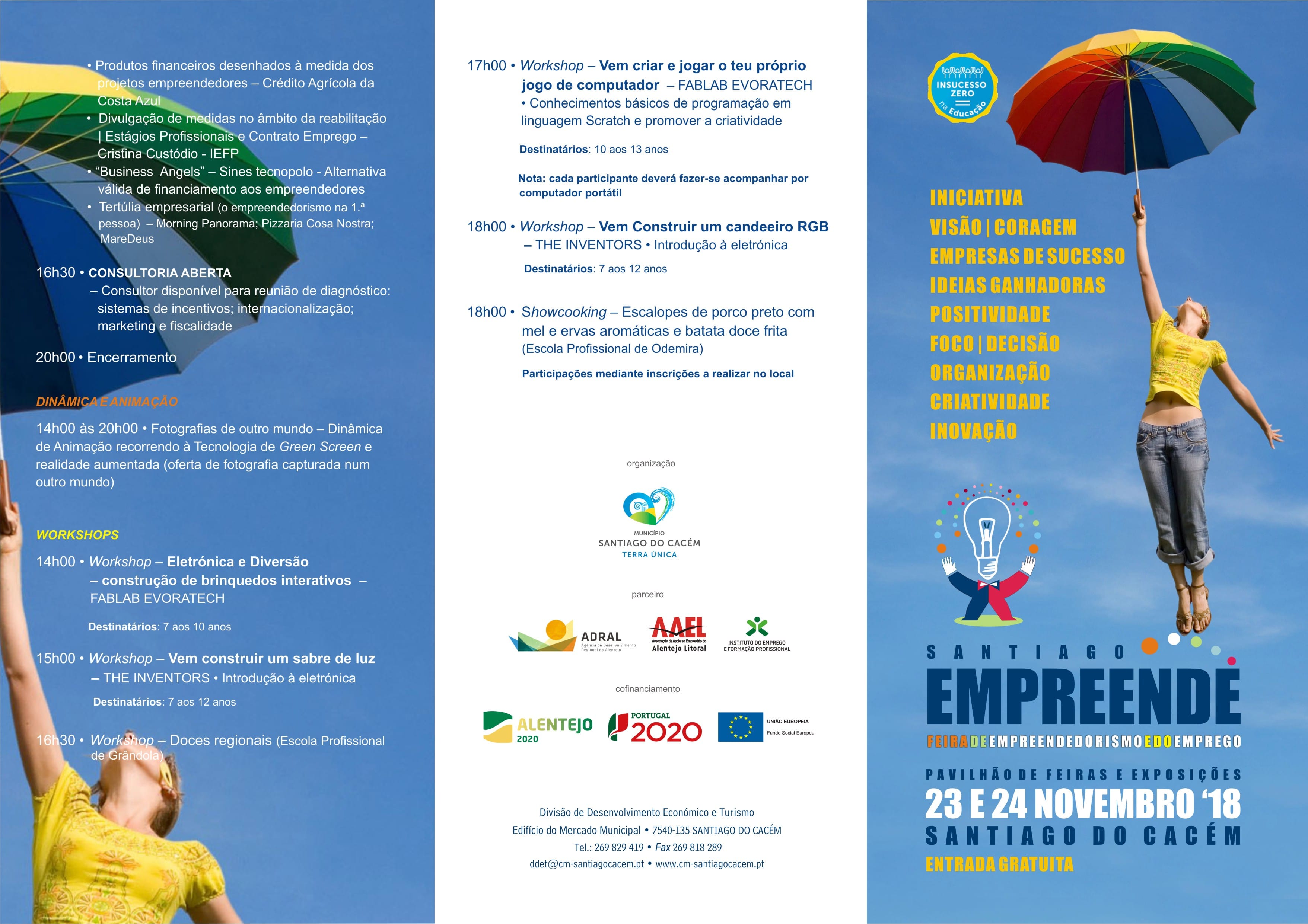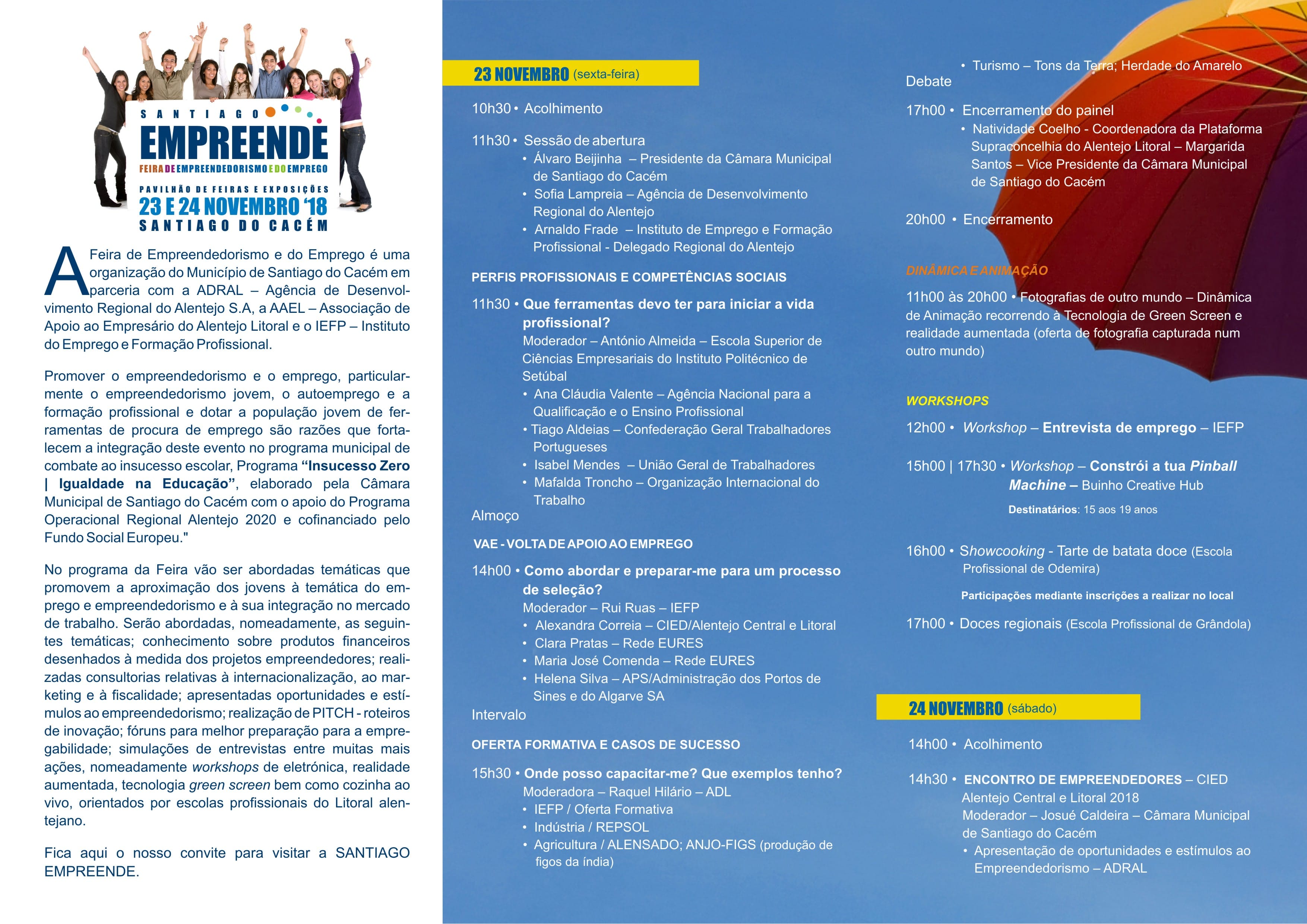 Nos dias 23 e 24 de novembro realiza-se no Pavilhão de Feiras e Exposições, em Santiago do Cacém, a feira do empreendedorismo e emprego – SANTIAGO EMPREENDE.
