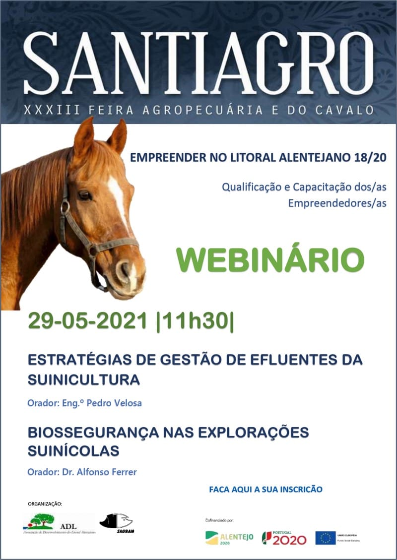 11h30 Webinar “Estratégias de Gestão de Efluentes da Suinicultura” e “Bio Segurança nas Explorações Suinícolas” – SAGRAN – Associação de Suinicultores dos Concelhos de Santiago do Cacém, Sines e Grândola