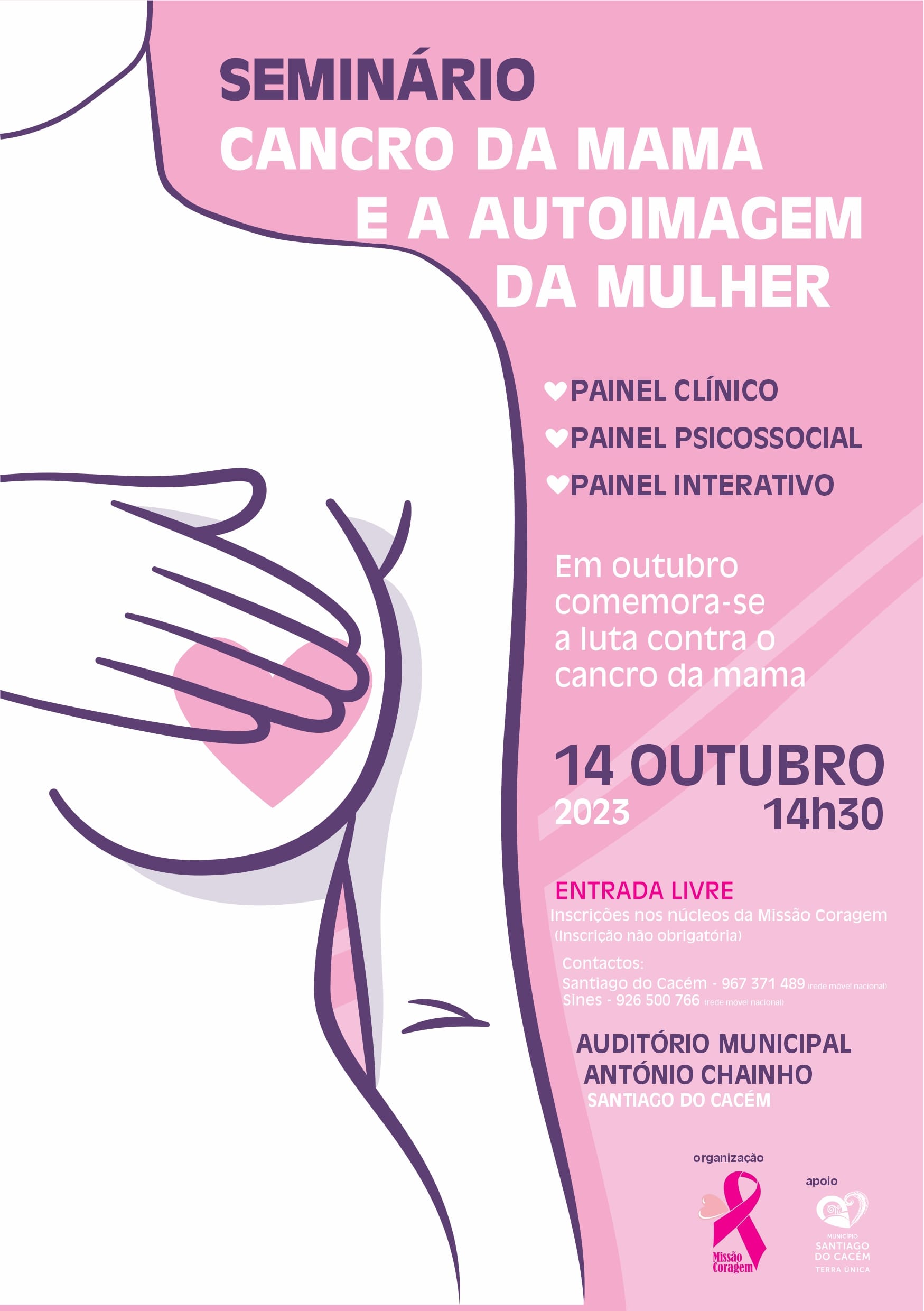 Realiza-se no dia 14 de outubro, às 14h30, no Auditório Municipal António Chainho, em Santiago do Cacém, um seminário sobre o Cancro da Mama e a Autoimagem da Mulher, com entrada livre, com organização da Missão Coragem e apoio da Câmara Municipal de Santiago do Cacém.