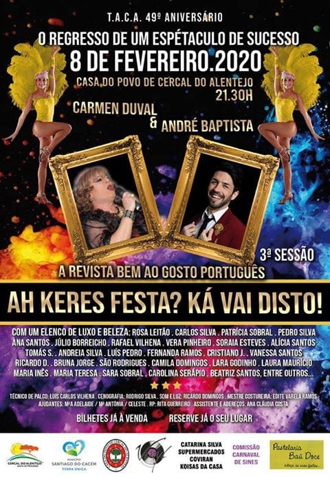 Dia 8 de fevereiro, o Teatro Amador do Cercal do Alentejo repõe a peça de Teatro de Revista “Ah Keres Festa? Ká vai disto!”. O espetáculo tem início às 21h3o, na Casa do Povo do Cercal do Alentejo e assinala o 49.º aniversário do grupo. Com a participação de Carmen Duval e André Baptista.