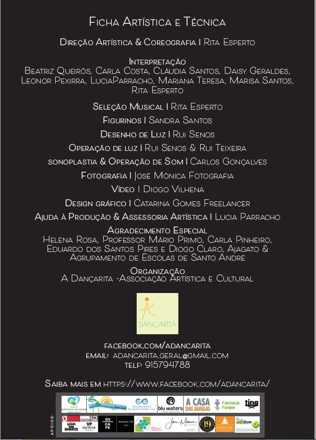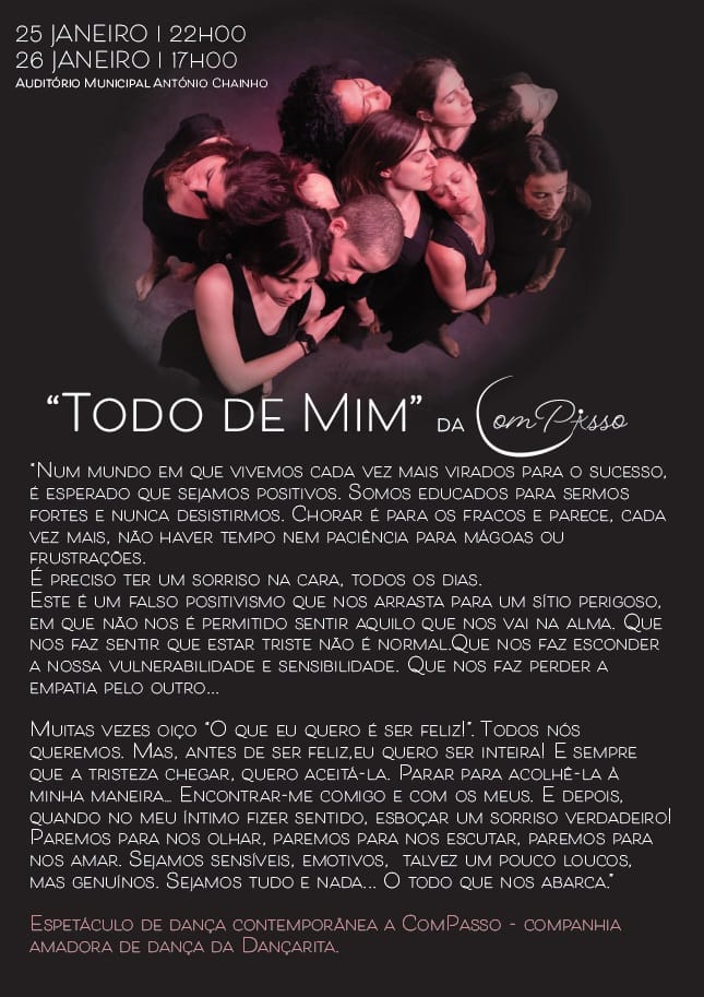 Espetáculo de dança contemporânea “TODO DE MIM” da Compasso – Companhia Amadora de Dança da Dançarita. Dia 25 (22h00) e 26 (17h00) de janeiro, no Auditório Municipal António Chainho, em Santiago do Cacém.