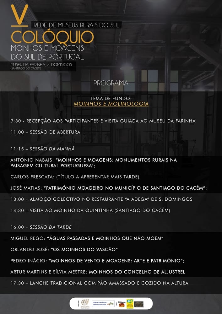 Realiza-se no dia 17 de novembro, no Museu da Farinha, em São Domingos, no concelho de Santiago do Cacém, o V Colóquio Rede de Museus Rurais do Sul, subordinado ao tema “Moinhos e Moagens do Sul de Portugal”. Inscrições por: museudafarinha@gmail.com / museururalidade@gmail.com ou através dos contactos: 961 388 217 / 286 915 329.
