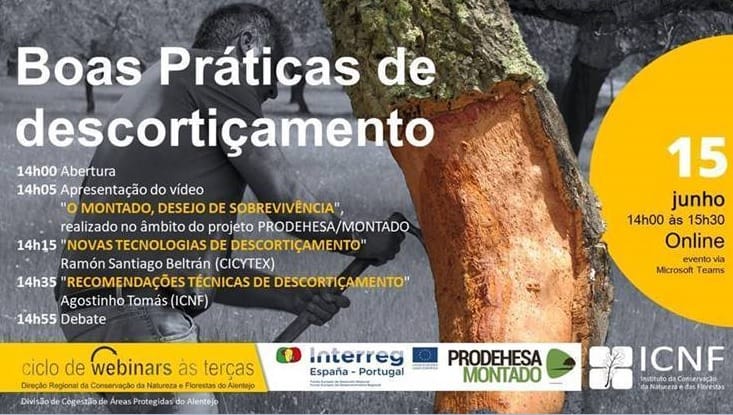 Realiza-se a 15 de junho, entre as 14h00 e as 15h30, o webinar subordinado ao tema: “Boas práticas de descortiçamento”, organizado pelo Instituto da Conservação da Natureza e das Florestas, I.P. , pela Direção Regional da Conservação da Natureza e Florestas do Alentejo e pela Divisão de Cogestão de Áreas Protegidas do Alentejo.