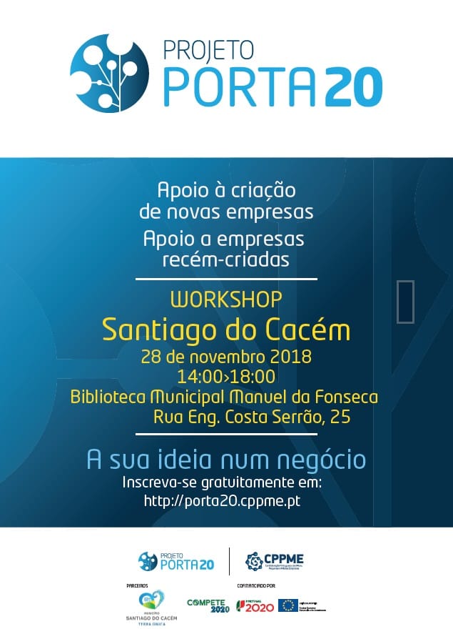 Realiza-se no dia 28 de novembro, entre as 14h00 e as 18h00, na Biblioteca Municipal Manuel da Fonseca, em Santiago do Cacém. Apoio à criação de novas empresas, apoio a empresas recém-criadas.