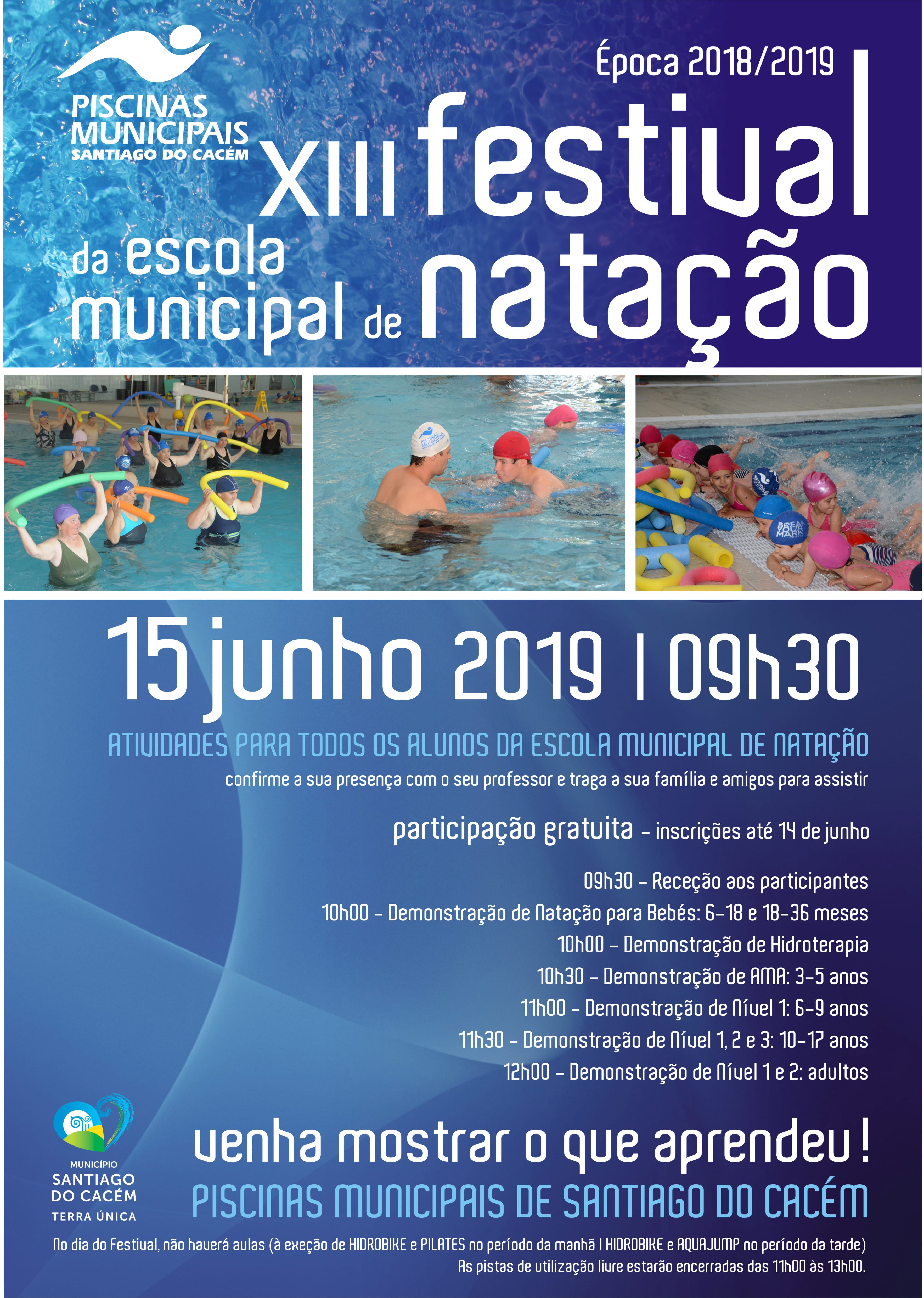 Dia 15 de junho, a partir das 9h30, realiza-se o XIII Festival de Natação da Escola Municipal. Atividades para todos os alunos da Escola Municipal de Natação. Participação gratuita!
