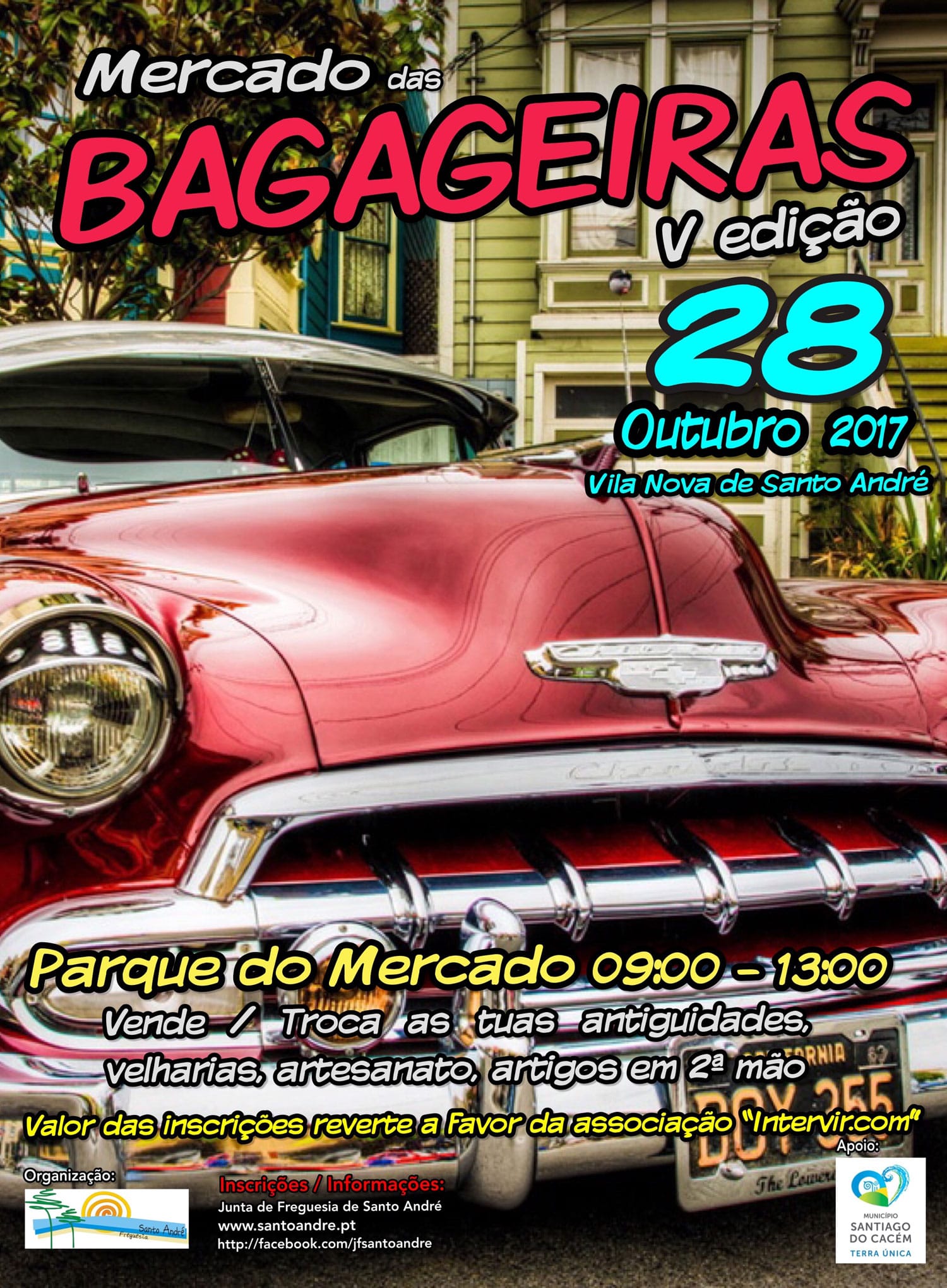 Vila Nova de Santo AndréNo dia 28 de outubro, das 9h00 às 13h00, realiza-se a V edição do Mercado das Bagageiras, no parque do Mercado Municipal, em Vila Nova de Santo André. Vende/troca as tuas antiguidades, velharias, artesanato, artigos em 2ª mão. O valor das inscrições reverte a favor da Associação "Intervir.com".