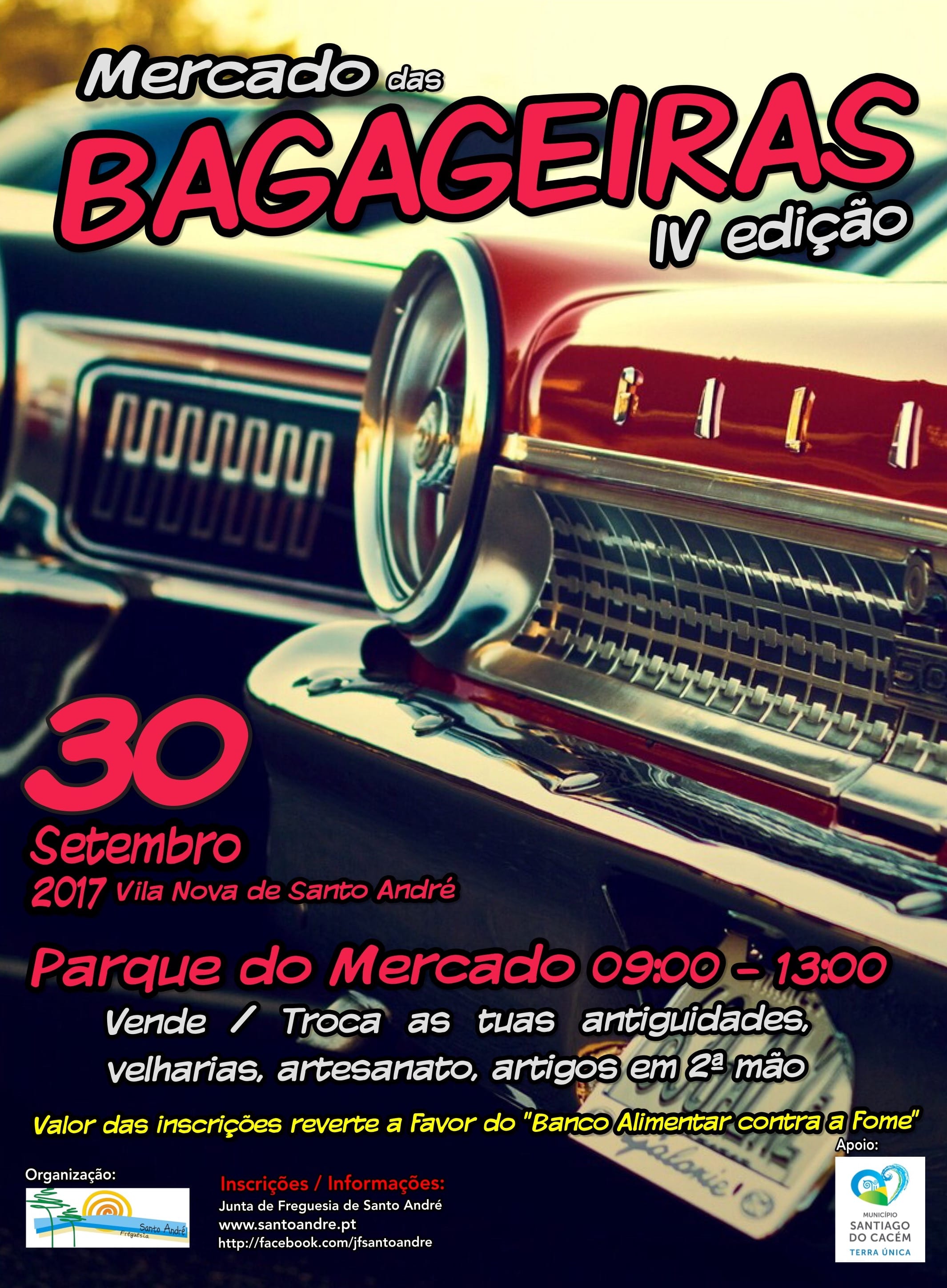 Vila Nova de Santo AndréDia 26 de agosto no parque do Mercado Municipal em Vila Nova de Santo André.Vende e troca as tuas antiguidades, velharias, artesanato, artigos em 2.ª mão. Ficha Inscrição_Mercado das bagageiras Regulamento_Mercado das bagageiras