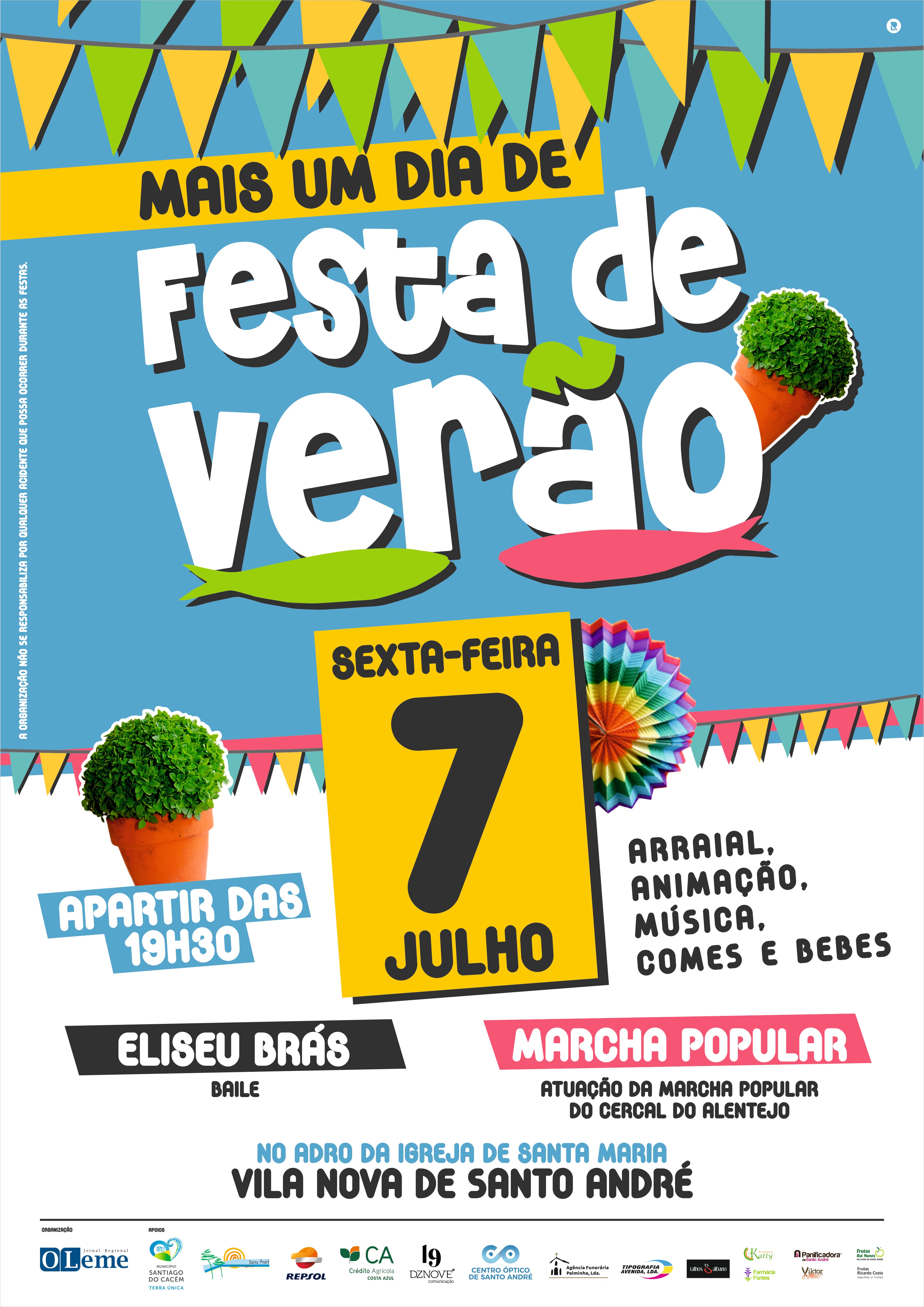 Vila Nova de Santo AndréDia 7 de julho, a partir das 19h30, no adro da Igreja de Santa Maria, mais um dia de Festa de Verão. Atuação da Marcha Popular do Cercal do Alentejo e baile com Eliseu Brás. Arraial, animação, música, comes e bebes. Não falte!