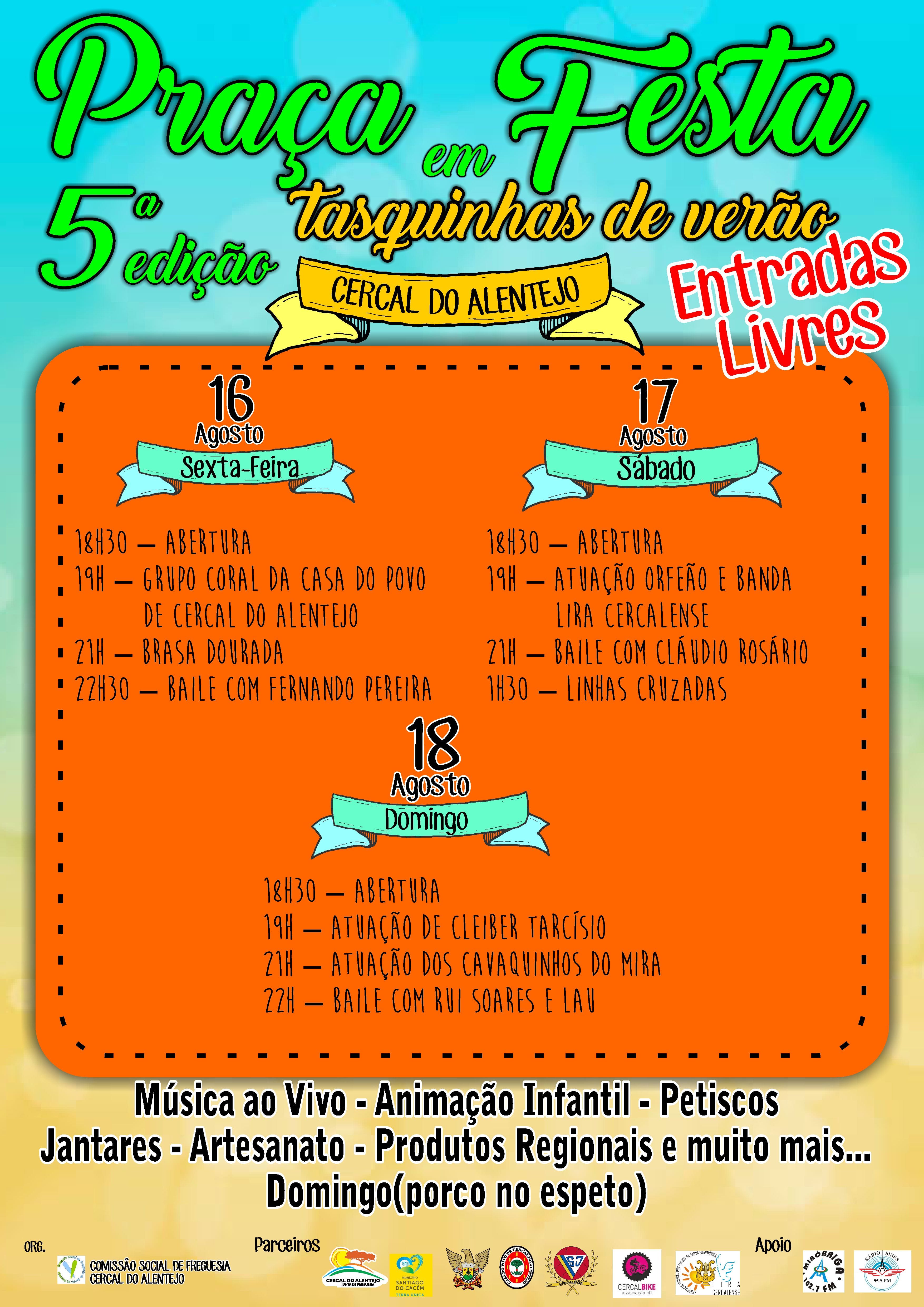 Cercal do AlentejoDe 16 a 18 de agosto, realiza-se "Praça em Festa Tasquinhas de Verão", no Mercado Municipal do Cercal do Alentejo. Música ao vivo, animação infantil, petiscos, jantares ( no domingo porco no espeto) artesanato, produtos regionais. Entradas Livres.