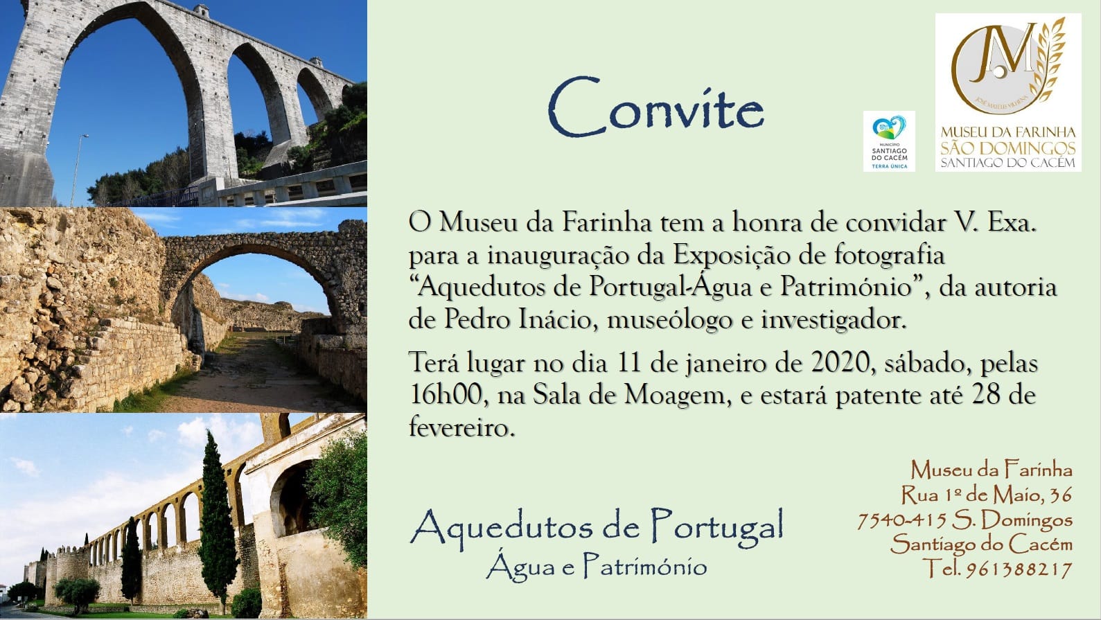 Inauguração da exposição de fotografia "Aquedutos de Portugal- Água e Património" de Pedro Inácio, museólogo e investigador, no Museu da Farinha dia 11 de janeiro, pelas 16h00, na Sala da Moagem. Exposição patente até 28 de fevereiro.